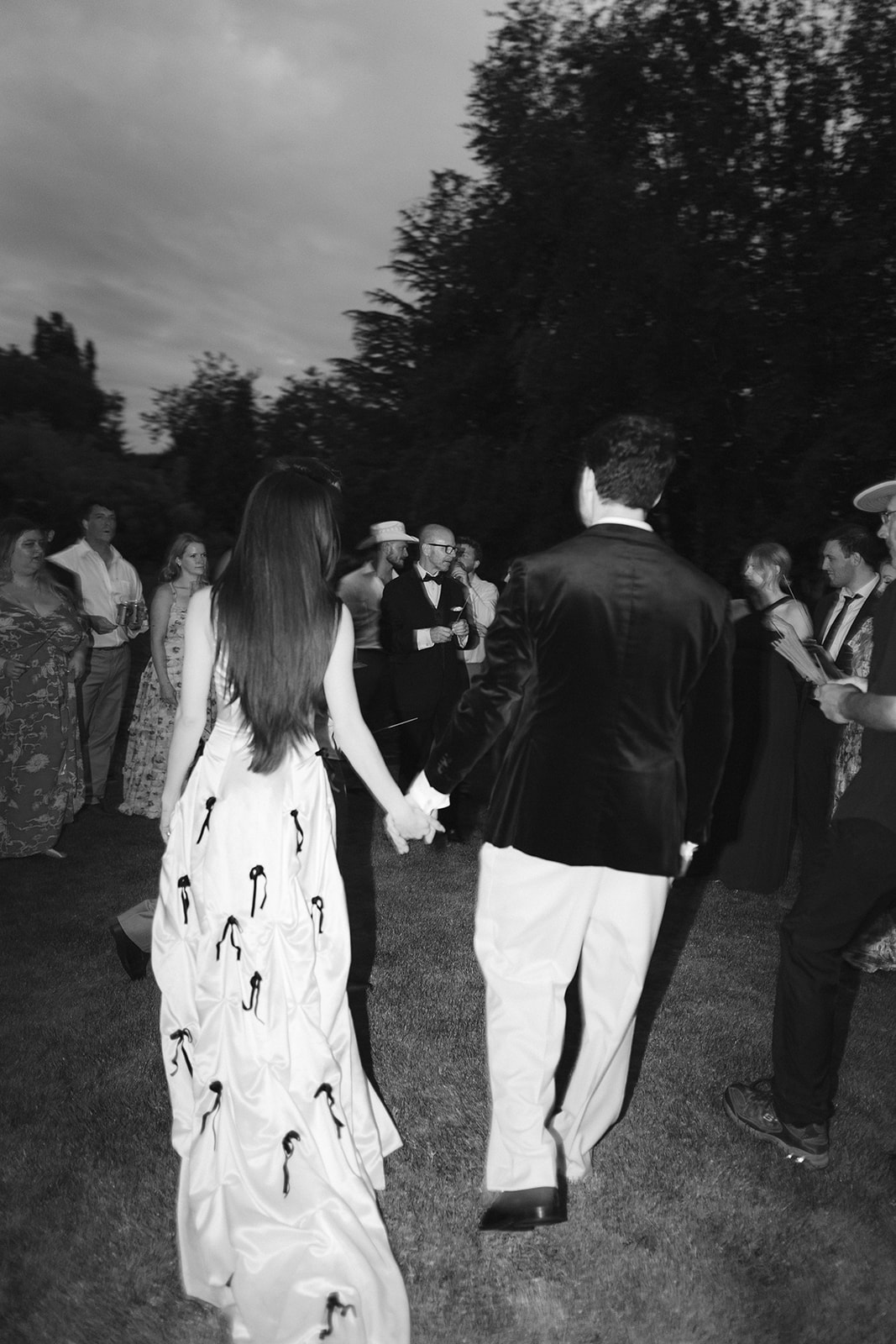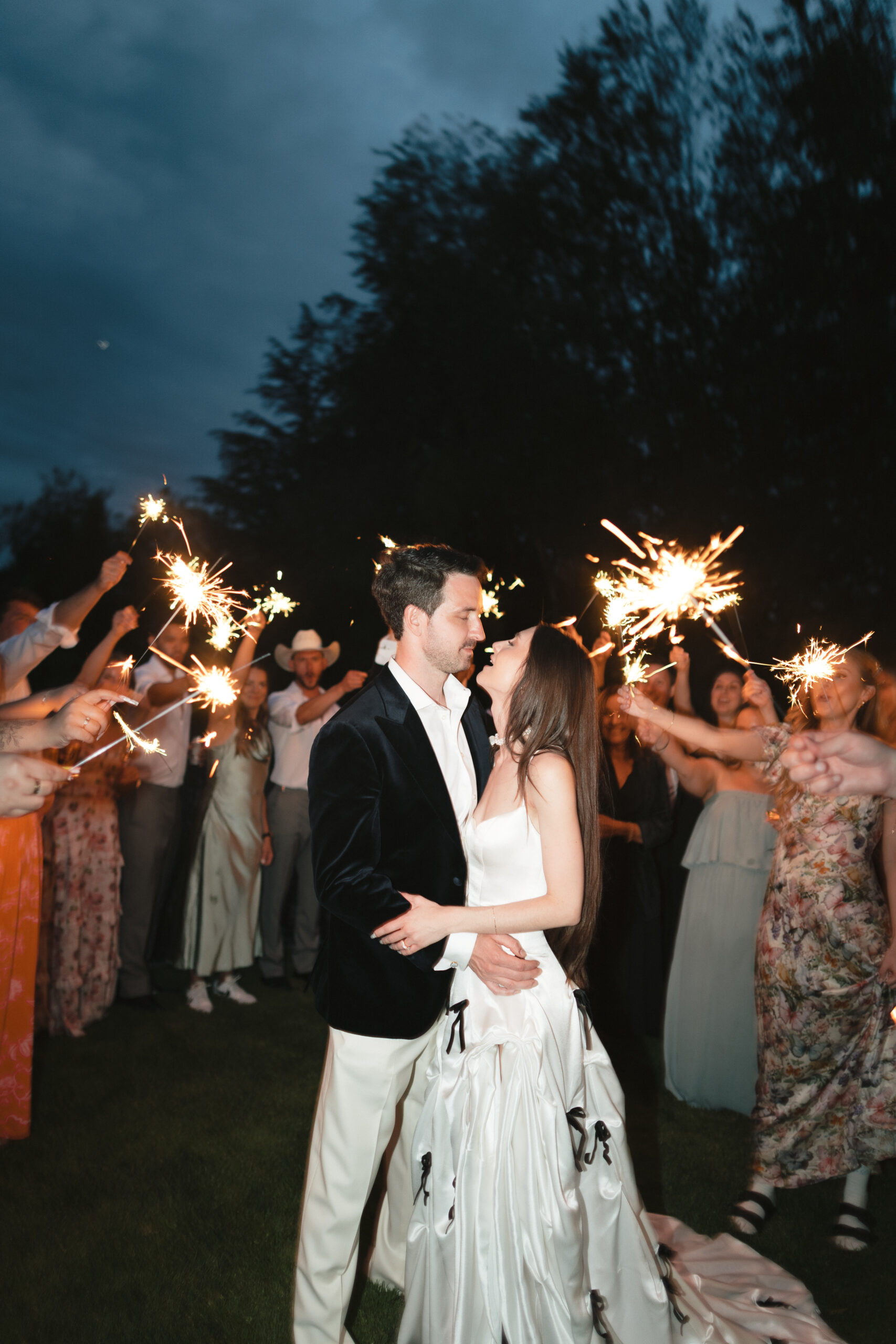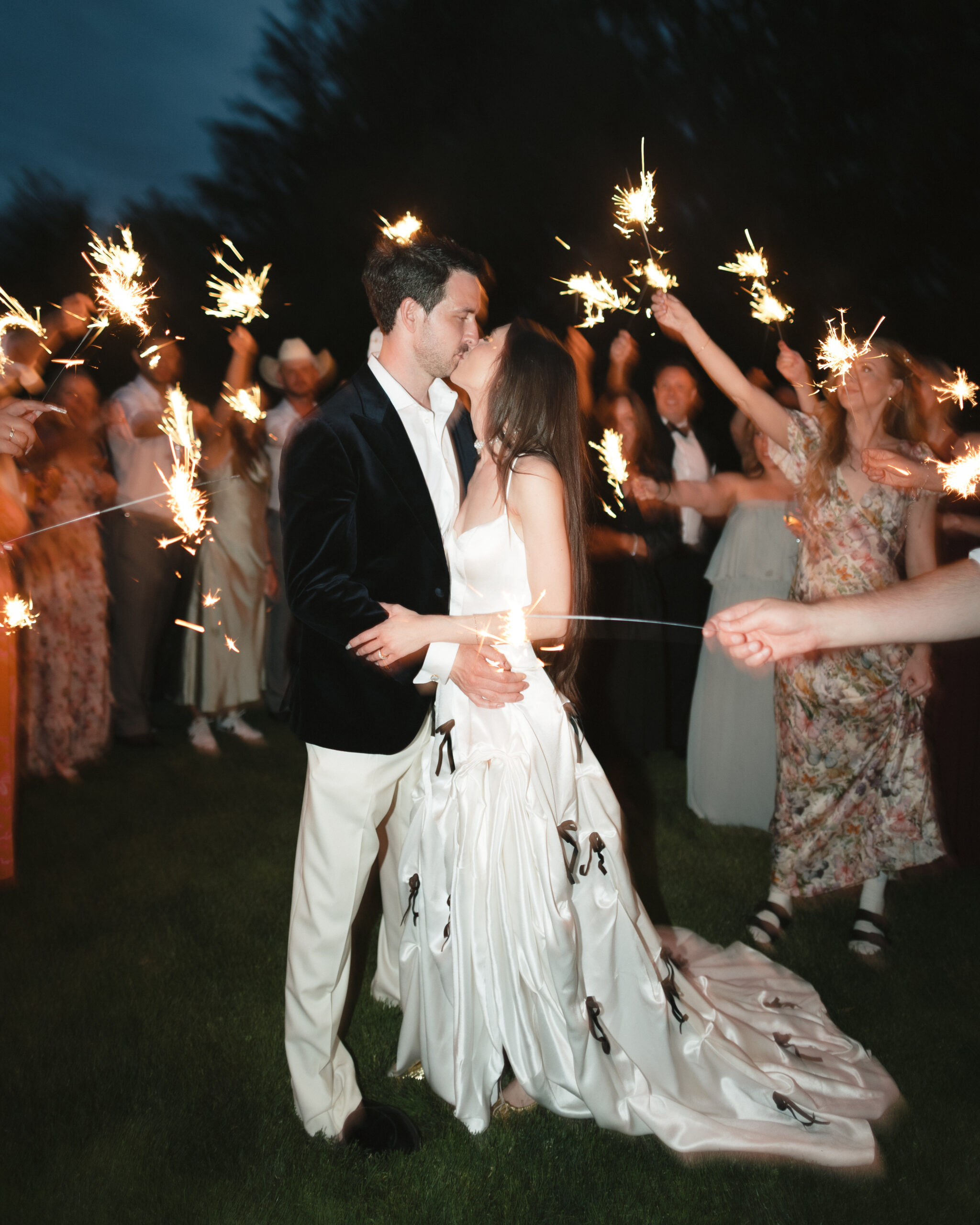 Just in time for their evening festivities, Hannah brought out two final surprise additions to her outfit: the most exquisite, embellished pearl cake bag by Simone Rocha (absolutely unreal), as well as a dress & shoe change for the dance floor. Adorned with dainty black bows, this satin gown offered a little more freedom to move and groove to the music—without sacrificing style. We lucked out with a gorgeous sunset to end the night, painting the sky in soft pinks and purples as if to celebrate the newlyweds. And what better way to end a Fourth of July wedding than with a dramatic sparkler exit? 🎇