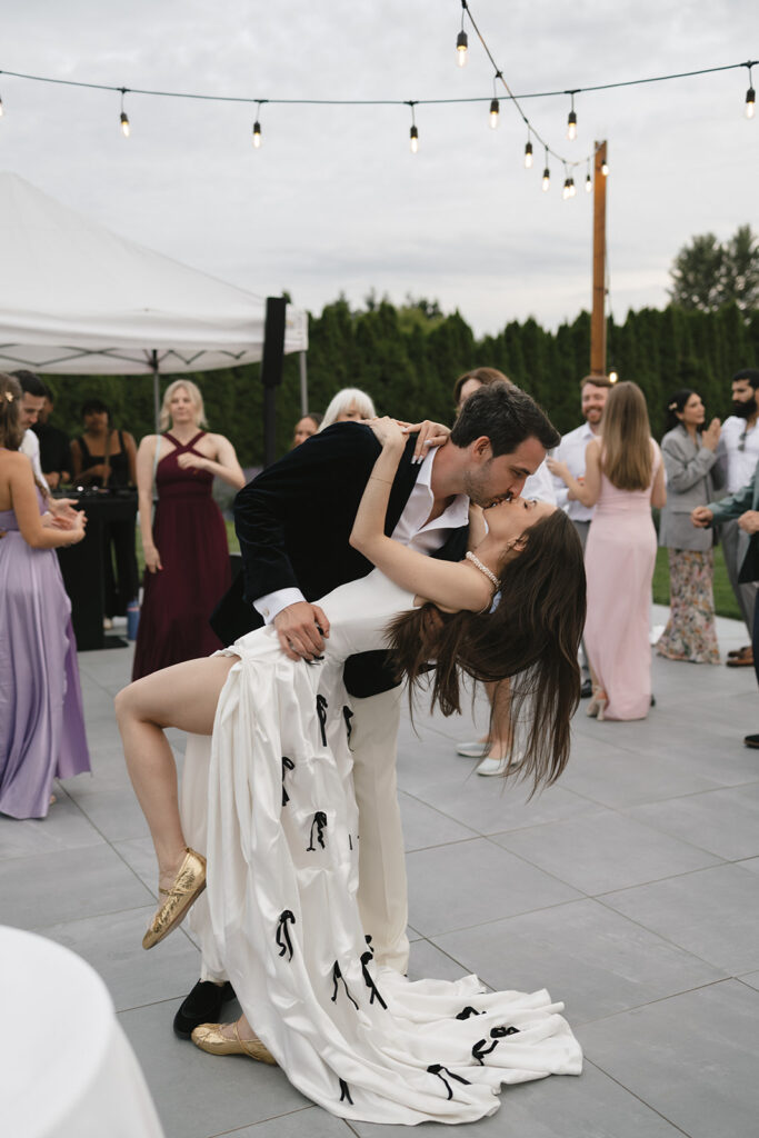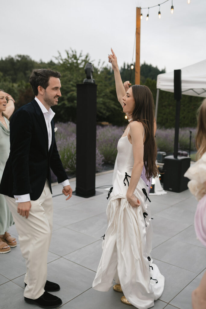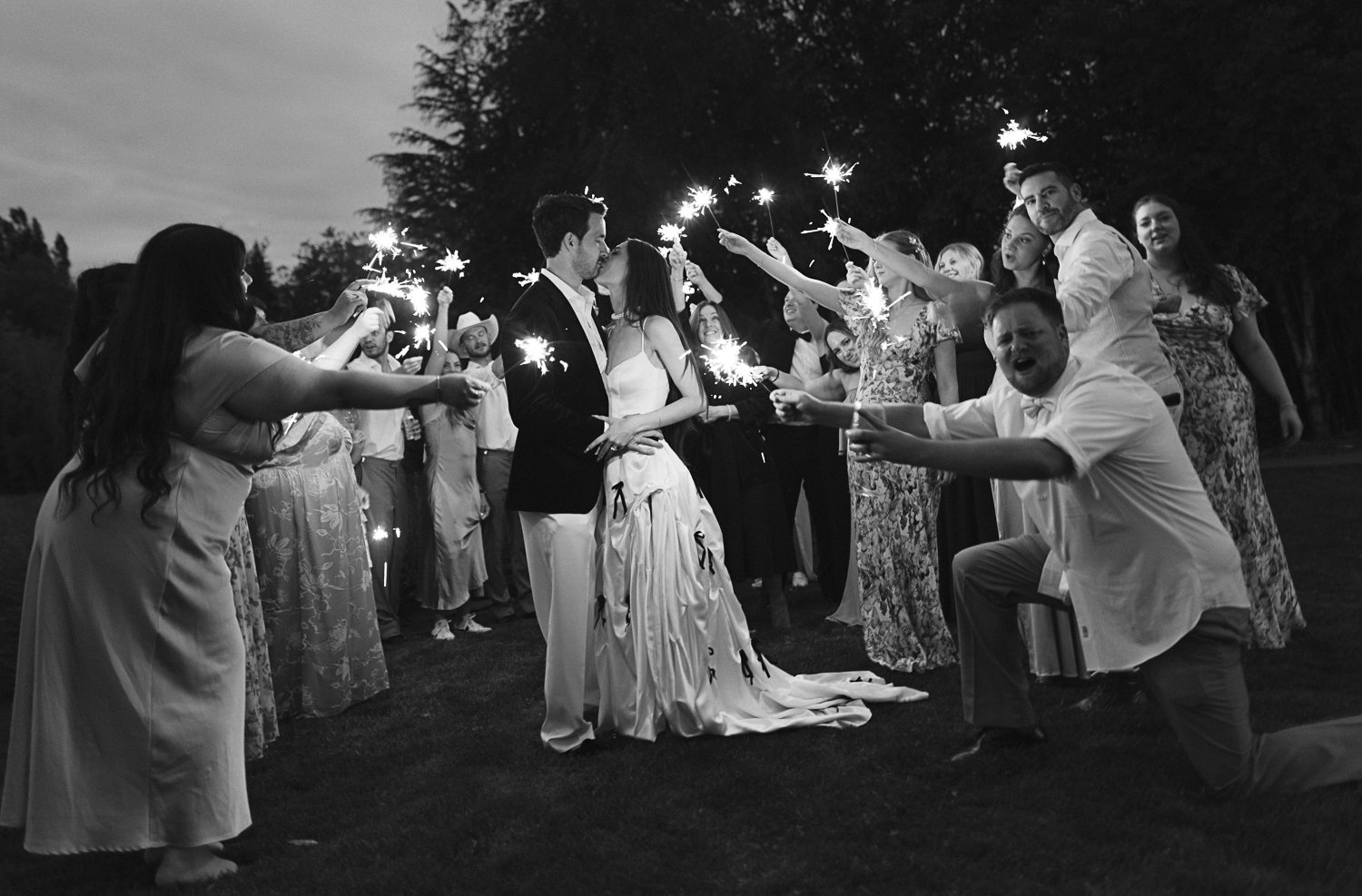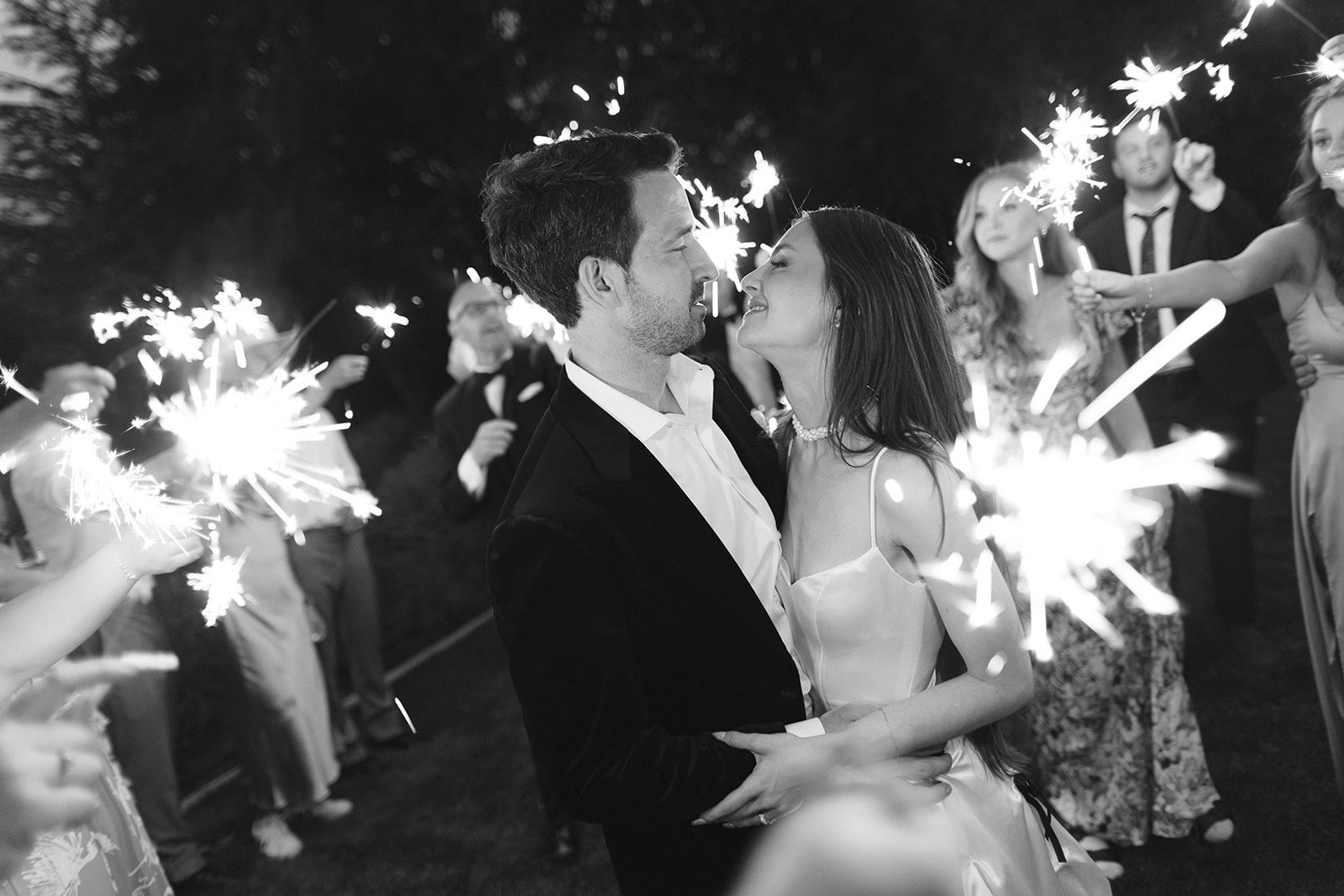 Just in time for their evening festivities, Hannah brought out two final surprise additions to her outfit: the most exquisite, embellished pearl cake bag by Simone Rocha (absolutely unreal), as well as a dress & shoe change for the dance floor. Adorned with dainty black bows, this satin gown offered a little more freedom to move and groove to the music—without sacrificing style. We lucked out with a gorgeous sunset to end the night, painting the sky in soft pinks and purples as if to celebrate the newlyweds. And what better way to end a Fourth of July wedding than with a dramatic sparkler exit? 🎇