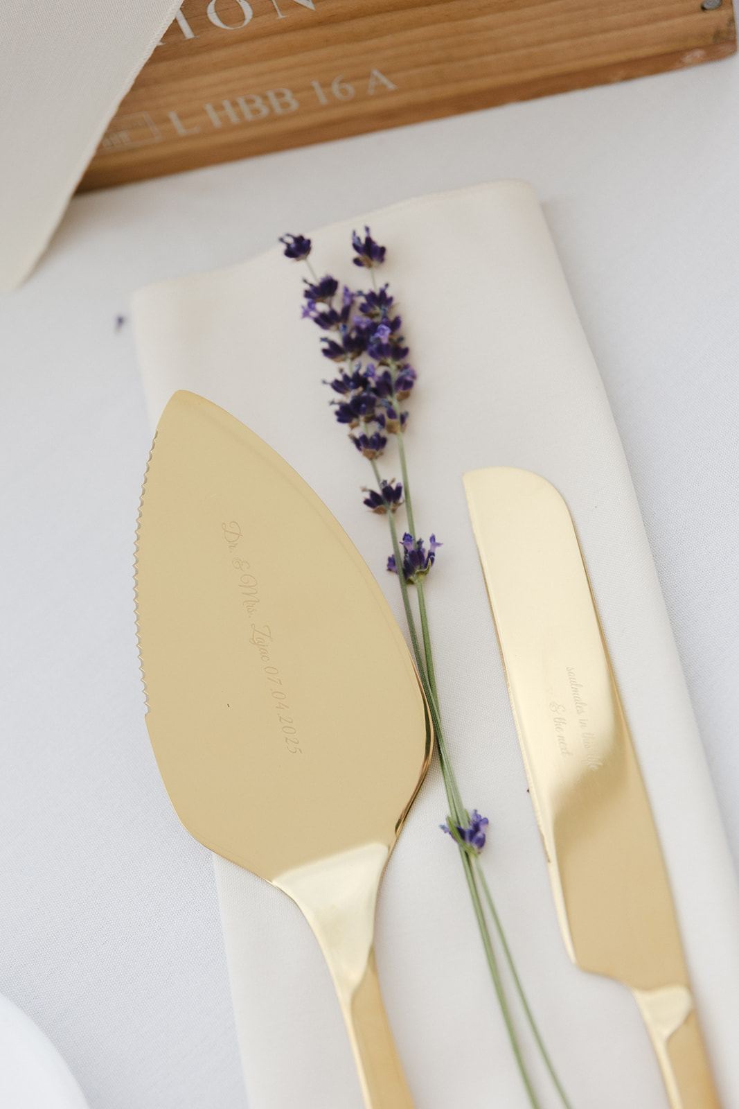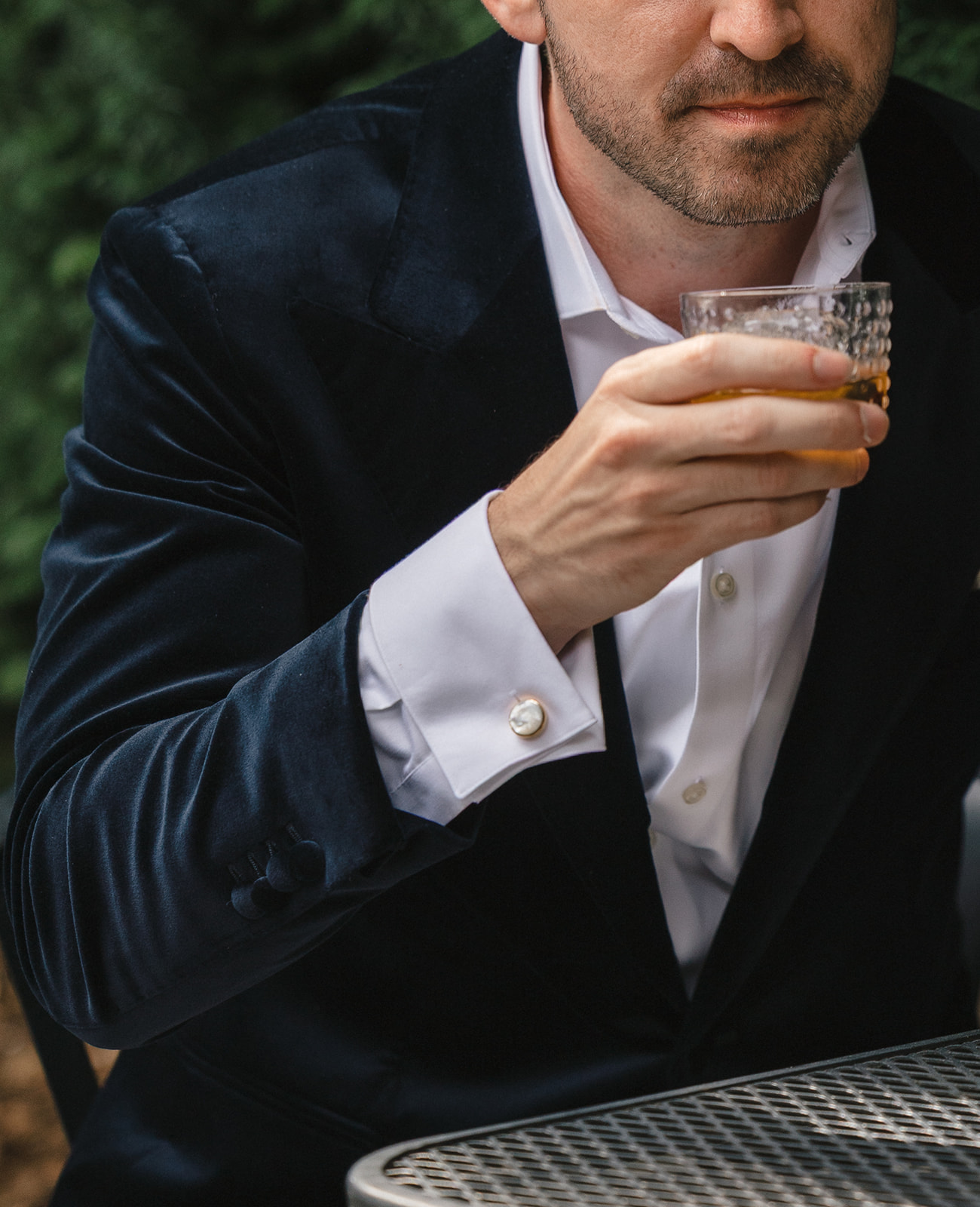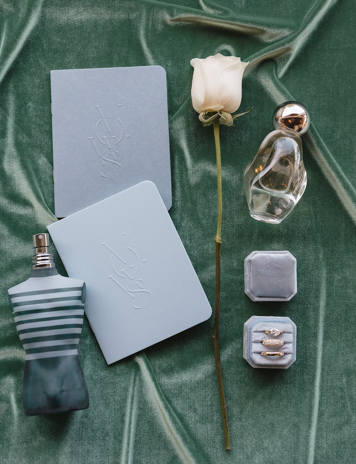 If I learned anything during Hannah and Peter’s rehearsal dinner, it was that they did not take their details lightly. Everywhere I looked I found a new item to capture—be it the golden wax seals and lavender buds displayed on their invitations, the vintage-style ring tray, or the sleek cake knives engraved with the soon-to-be spouses’ shared last name. And to think, I haven’t even mentioned the cocktail napkins featuring their cats’ adorable faces, the audio guestbook, or the custom dinner plates for every guest! I’m telling you: thoughtful details like these will never go unnoticed, and are what shape the larger experience of your wedding for everyone involved.