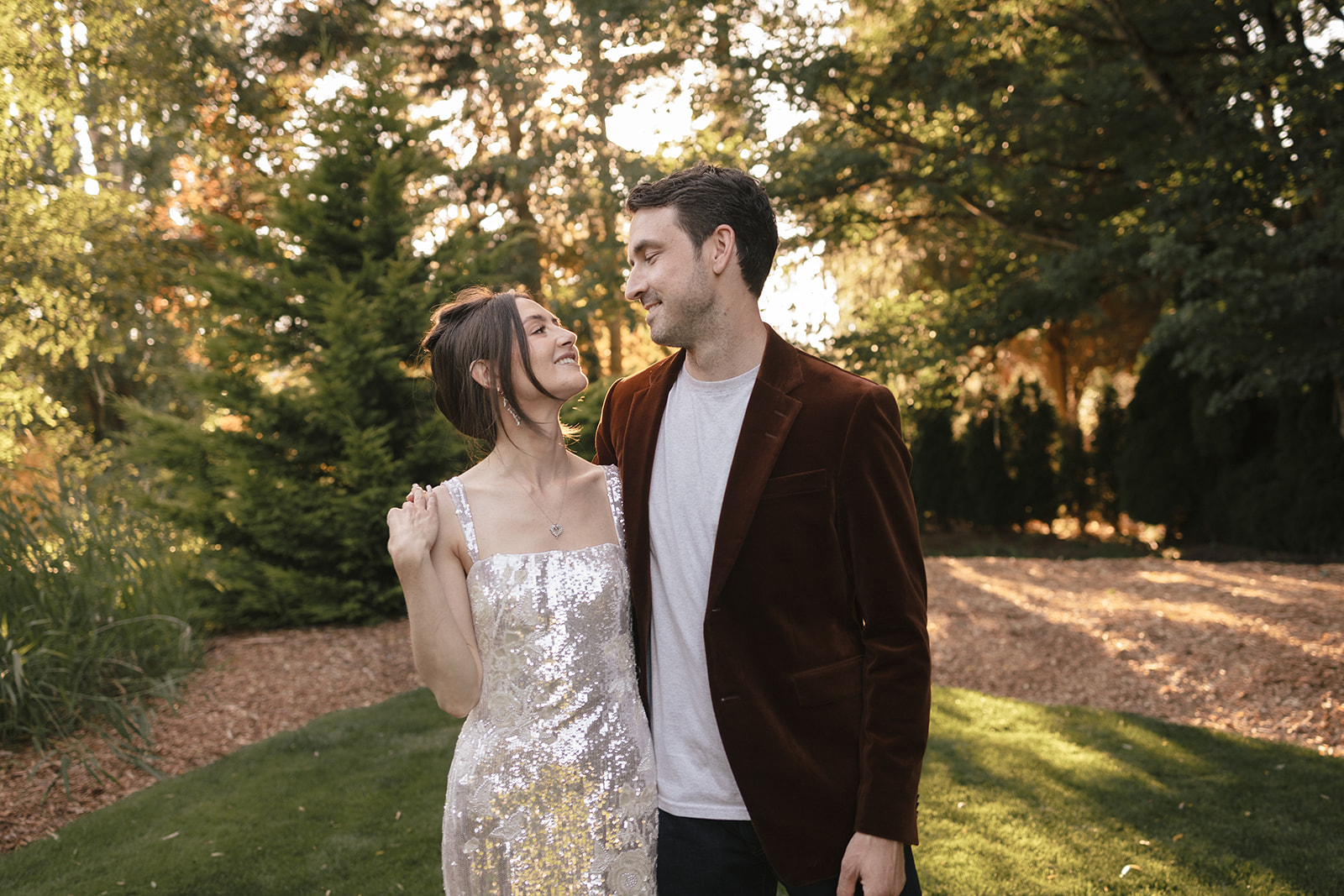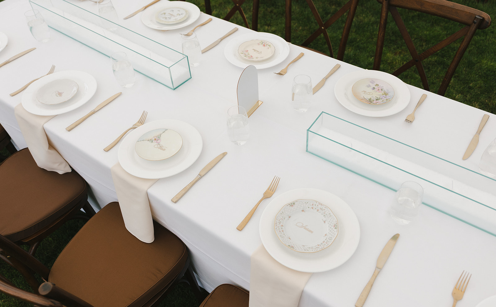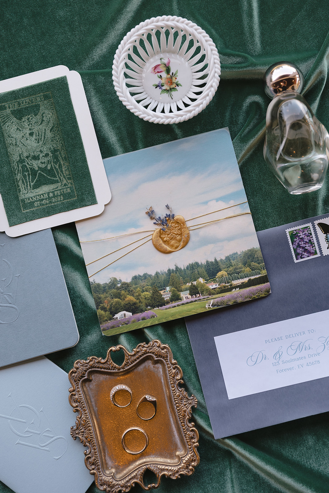 If I learned anything during Hannah and Peter’s rehearsal dinner, it was that they did not take their details lightly. Everywhere I looked I found a new item to capture—be it the golden wax seals and lavender buds displayed on their invitations, the vintage-style ring tray, or the sleek cake knives engraved with the soon-to-be spouses’ shared last name. And to think, I haven’t even mentioned the cocktail napkins featuring their cats’ adorable faces, the audio guestbook, or the custom dinner plates for every guest! I’m telling you: thoughtful details like these will never go unnoticed, and are what shape the larger experience of your wedding for everyone involved.