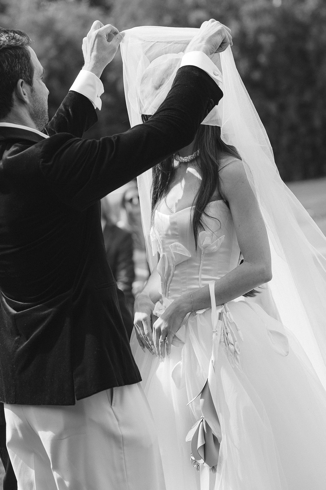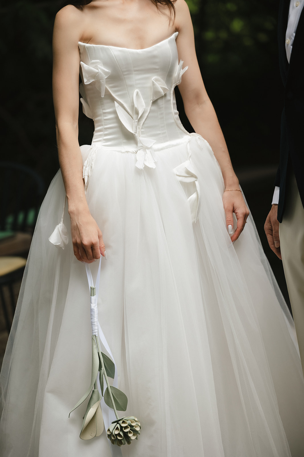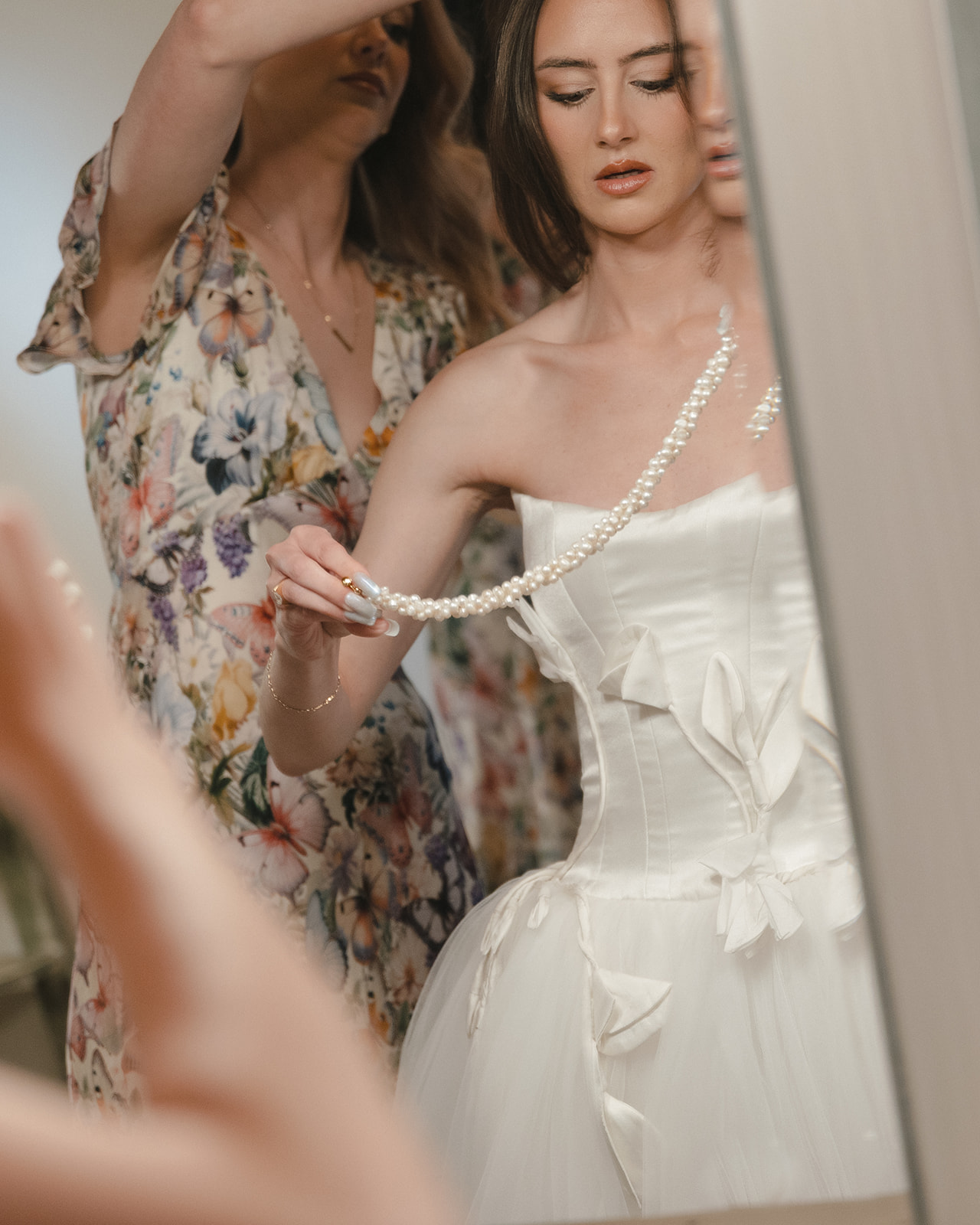 We haven’t even touched on her array of accessories yet, but that is truly where the magic lay in Hannah’s bridal attire. As if her magnificent gown weren’t enough, a multi-layered, twisted pearl choker from McQueen Gems completed the look, as did the most striking leather dalium flower she held in place of a bouquet. Yes, a leather flower—and yes, it was one of the coolest alternatives I’ve ever seen to traditional bridal florals. You can shop this beautiful piece (and others like it) at Polène.
