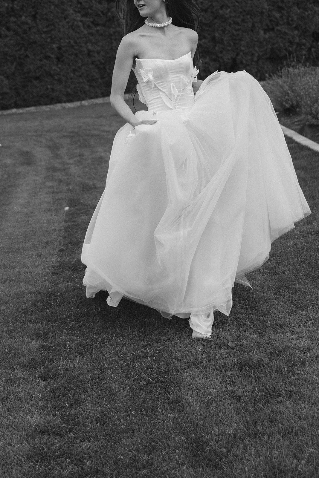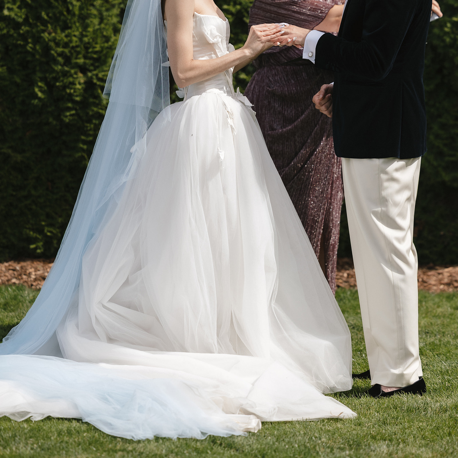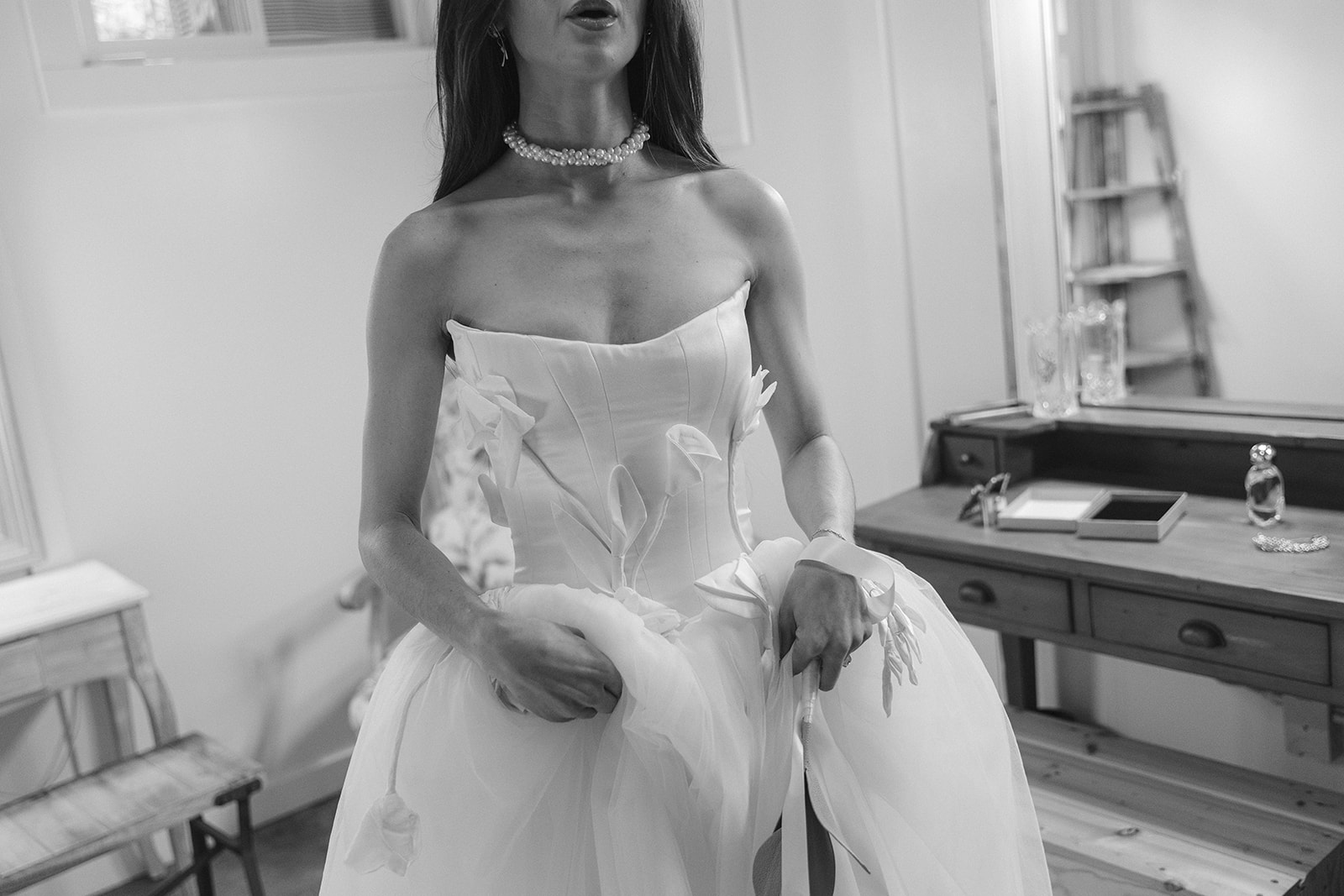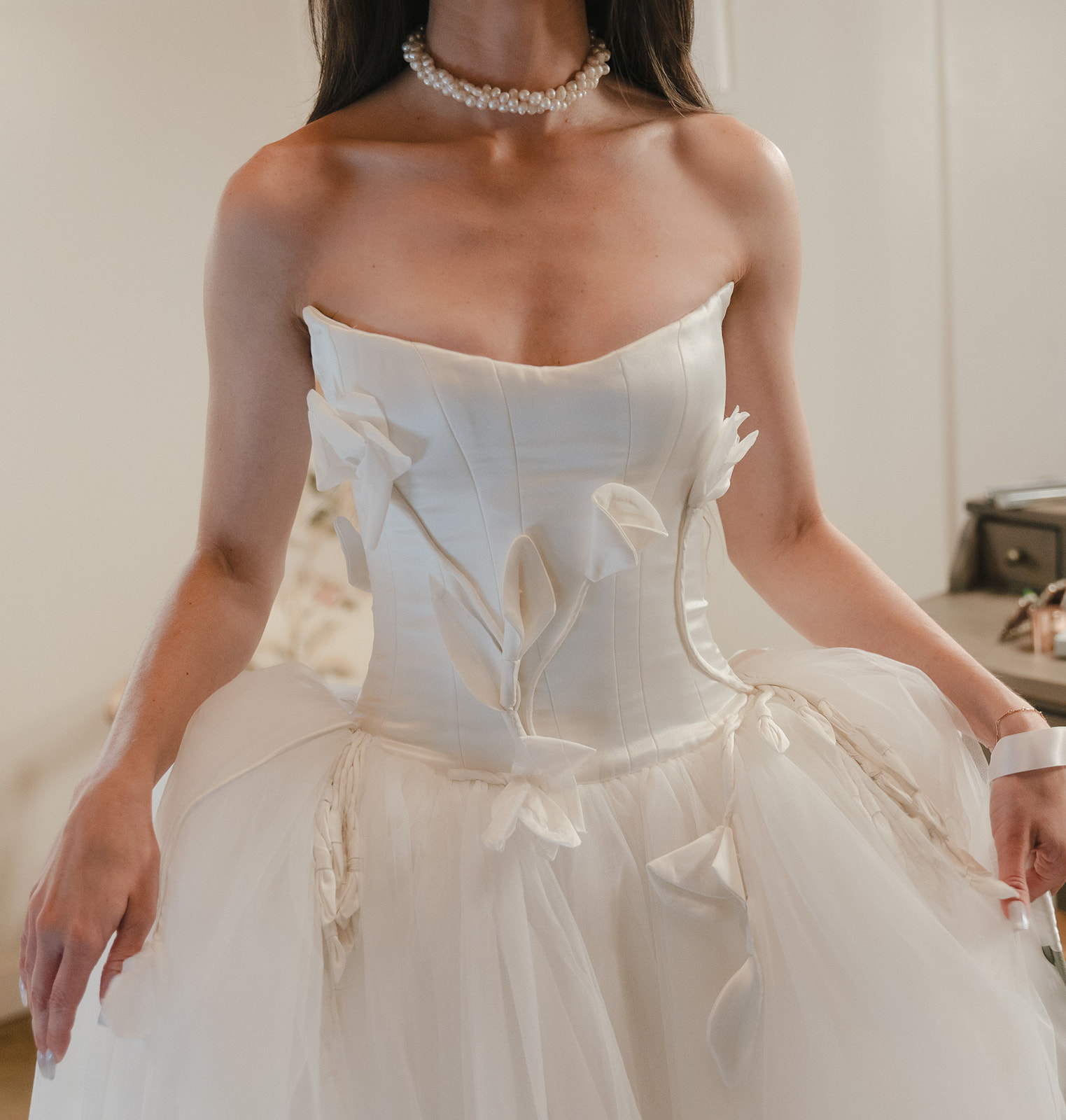 Hannah wore a spectacular gown designed by Floure Studio (the Esme, to be exact), crafted with a corseted silk bodice and handmade 3D floral appliqué that BLEW me away. Paired with a voluminous tulle skirt and a wildly dramatic, sweeping train, this corset added just enough structure to really make the skirt pop; effortlessly fashionable and romantic in every way. This gown—and the pearl hanger Hannah brought for it—stole the show, and rightly so.