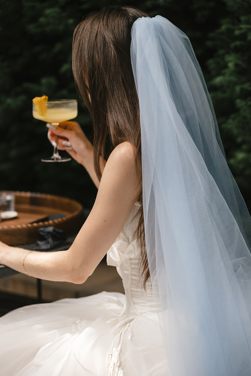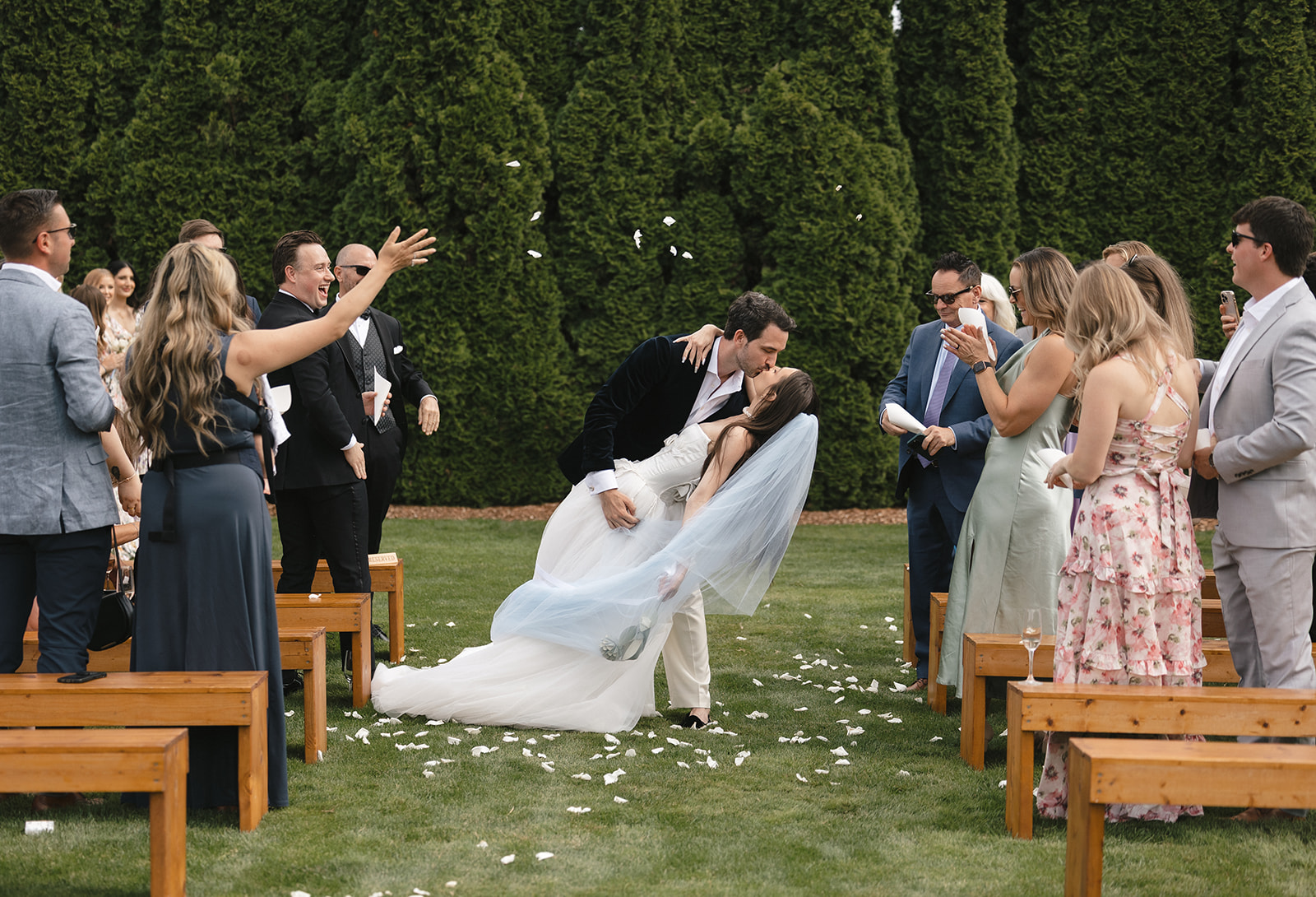 And if your jaw isn’t on the floor already, it’s about to be when you see Hannah walk down the aisle donning not only her splendid gown, but the custom blue veil she had made for a little touch of color. These two glowed in the sunshine as they exchanged their vows, cheered on by family and friends as they shared an ever-dramatic dip kiss in front of the greenery. It was officially official: Hannah and Peter were finally Mr. & Mrs. Zajac 🍾