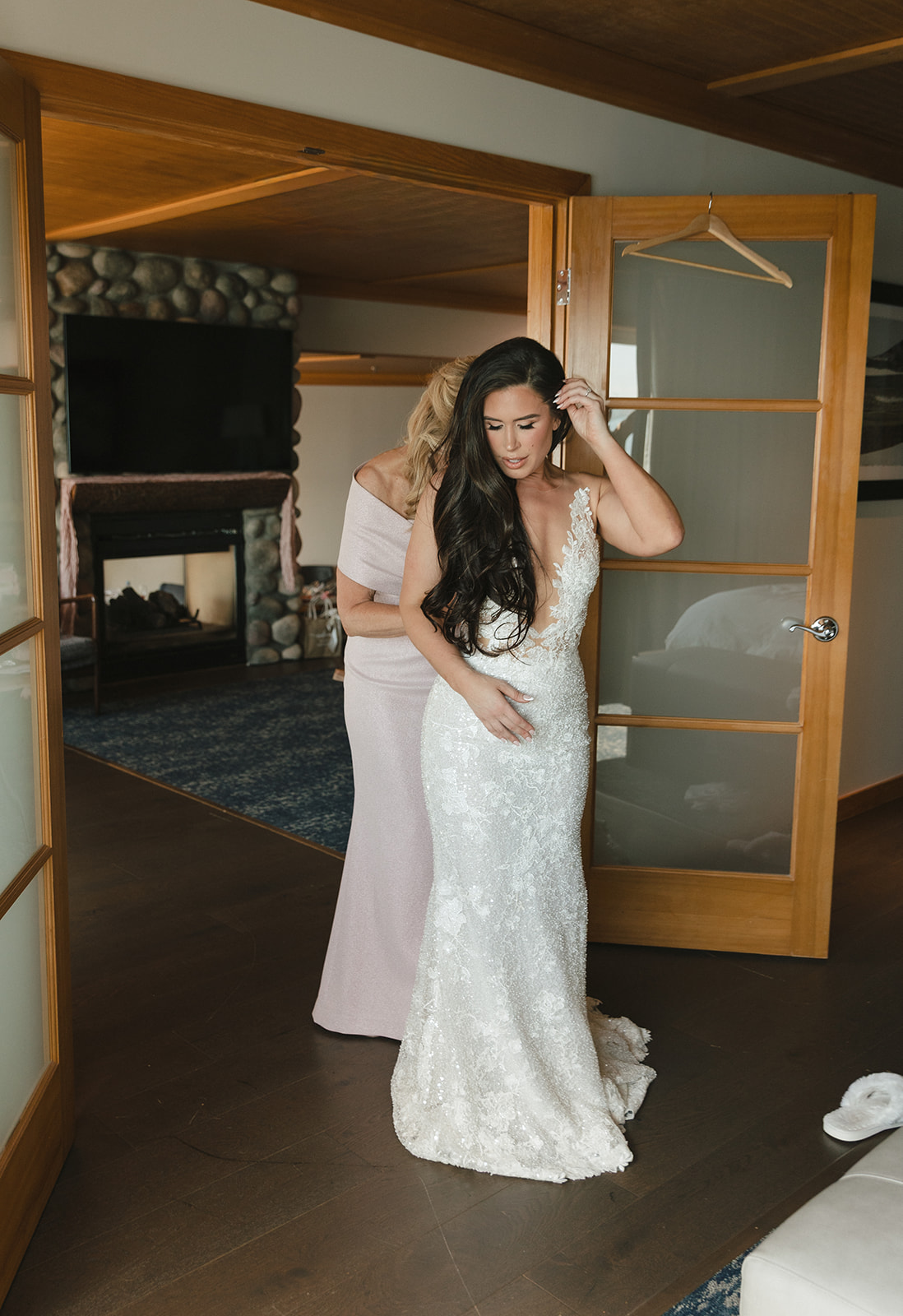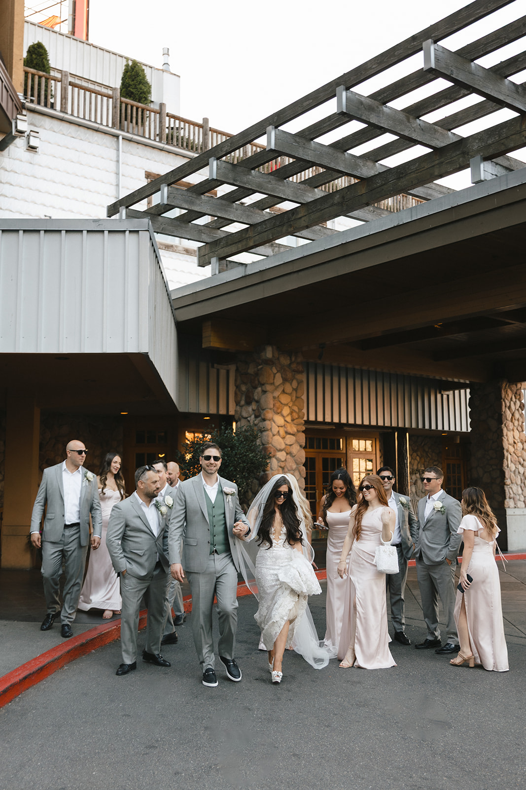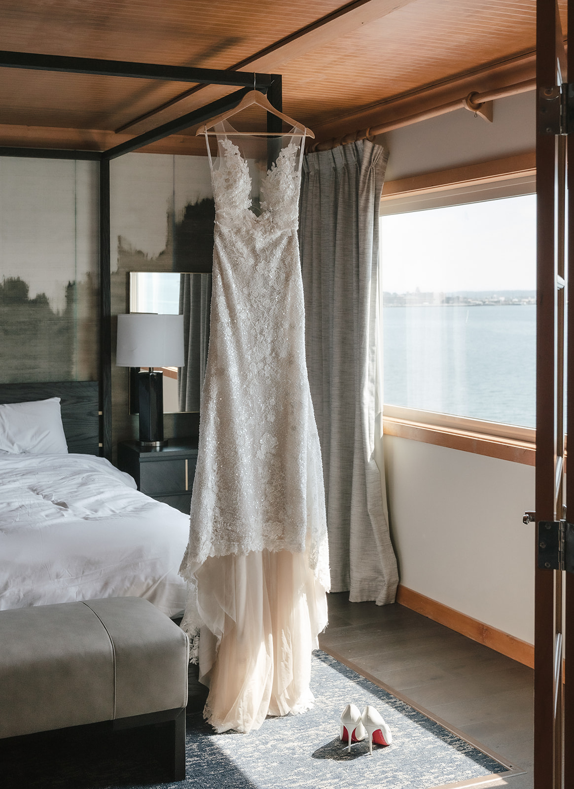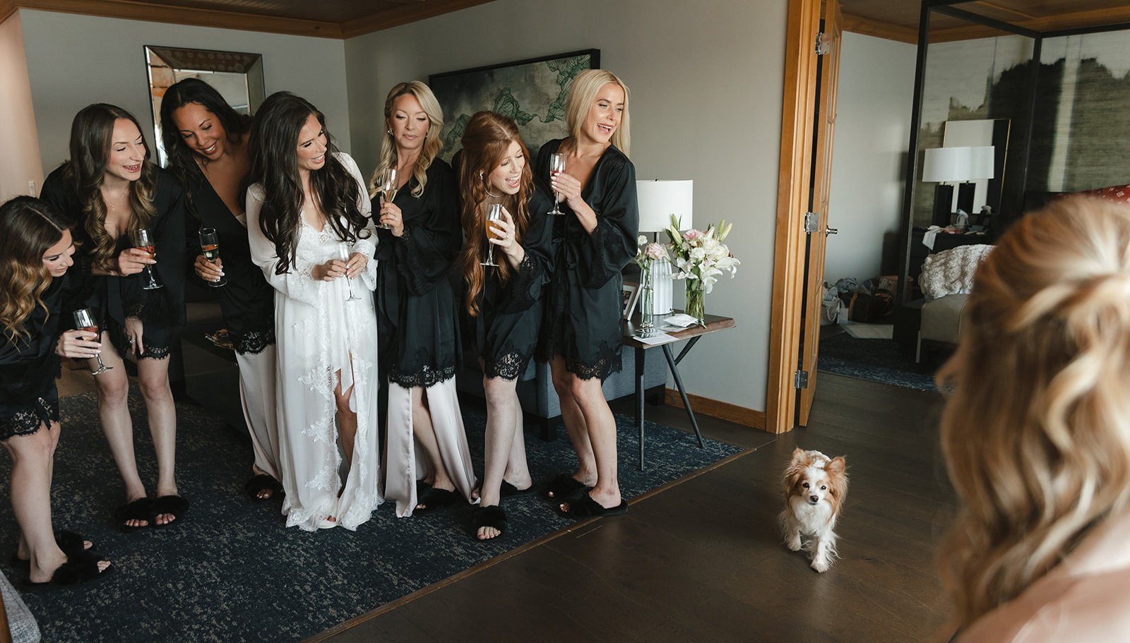 Emily got ready in a beautiful suite at the Edgewater, enjoying a morning of mimosas and stunning waterfront views alongside her closest group of gals. Donning silk black robes with champagne glasses in hand, these gorgeous women were Emily’s biggest cheerleaders as she prepared to walk down the aisle, and transformed into the most breathtaking bride. Designer jewelry and accessories covered seemingly every surface of the suite, with sparkling Swarovski necklaces, Versace perfume, Chanel chains, and glistening white pearls galore—too many to count. Emily was truly every bit the grunge-luxe bride she had been dreaming of, as was Mark as the groom, sporting a classy gray tux with a forest-green waistcoat.