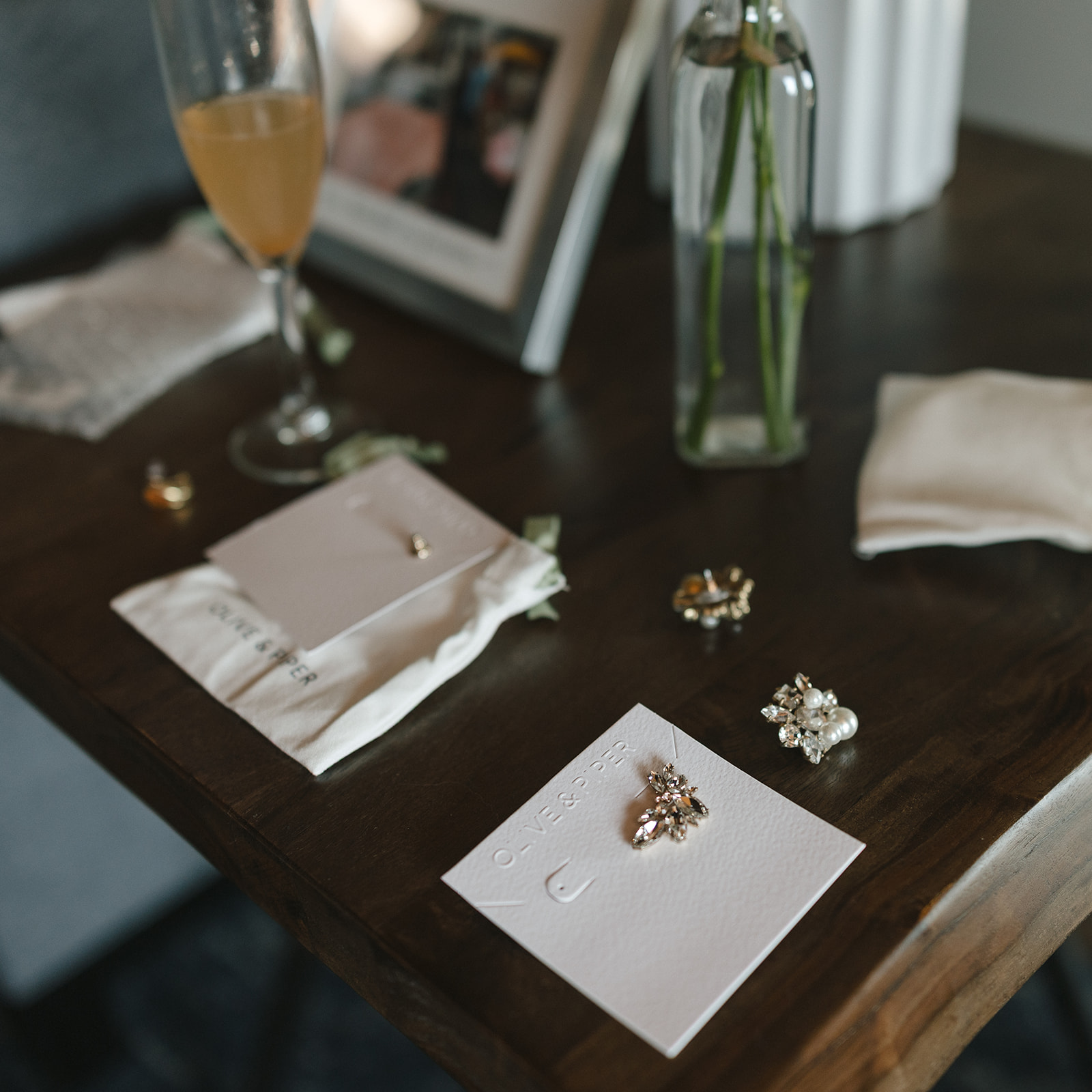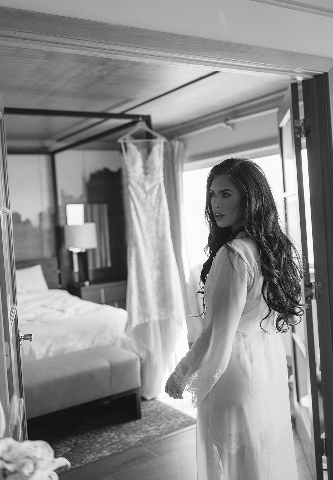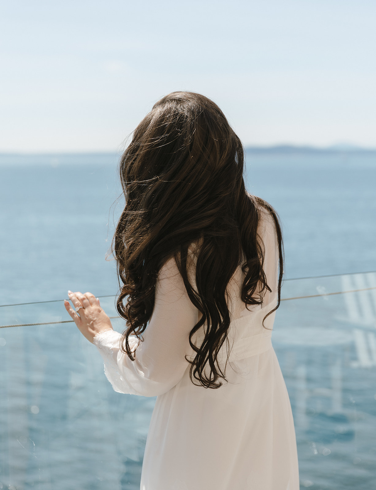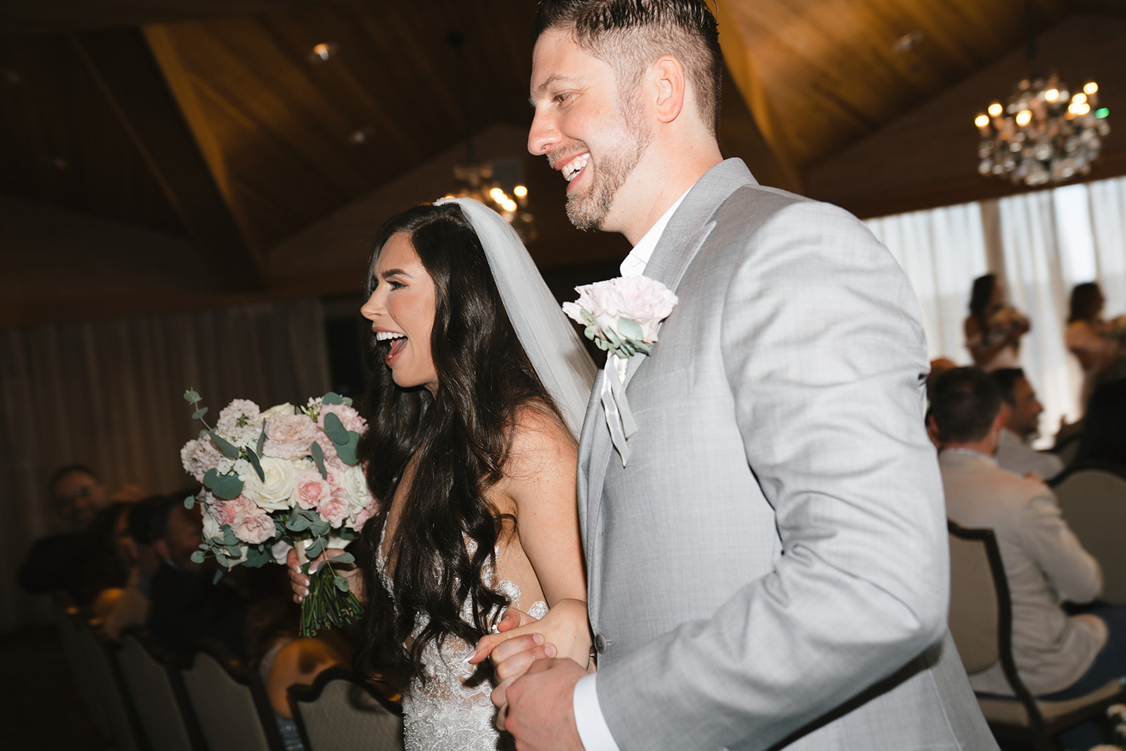 Emily got ready in a beautiful suite at the Edgewater, enjoying a morning of mimosas and stunning waterfront views alongside her closest group of gals. Donning silk black robes with champagne glasses in hand, these gorgeous women were Emily’s biggest cheerleaders as she prepared to walk down the aisle, and transformed into the most breathtaking bride. Designer jewelry and accessories covered seemingly every surface of the suite, with sparkling Swarovski necklaces, Versace perfume, Chanel chains, and glistening white pearls galore—too many to count. Emily was truly every bit the grunge-luxe bride she had been dreaming of, as was Mark as the groom, sporting a classy gray tux with a forest-green waistcoat.