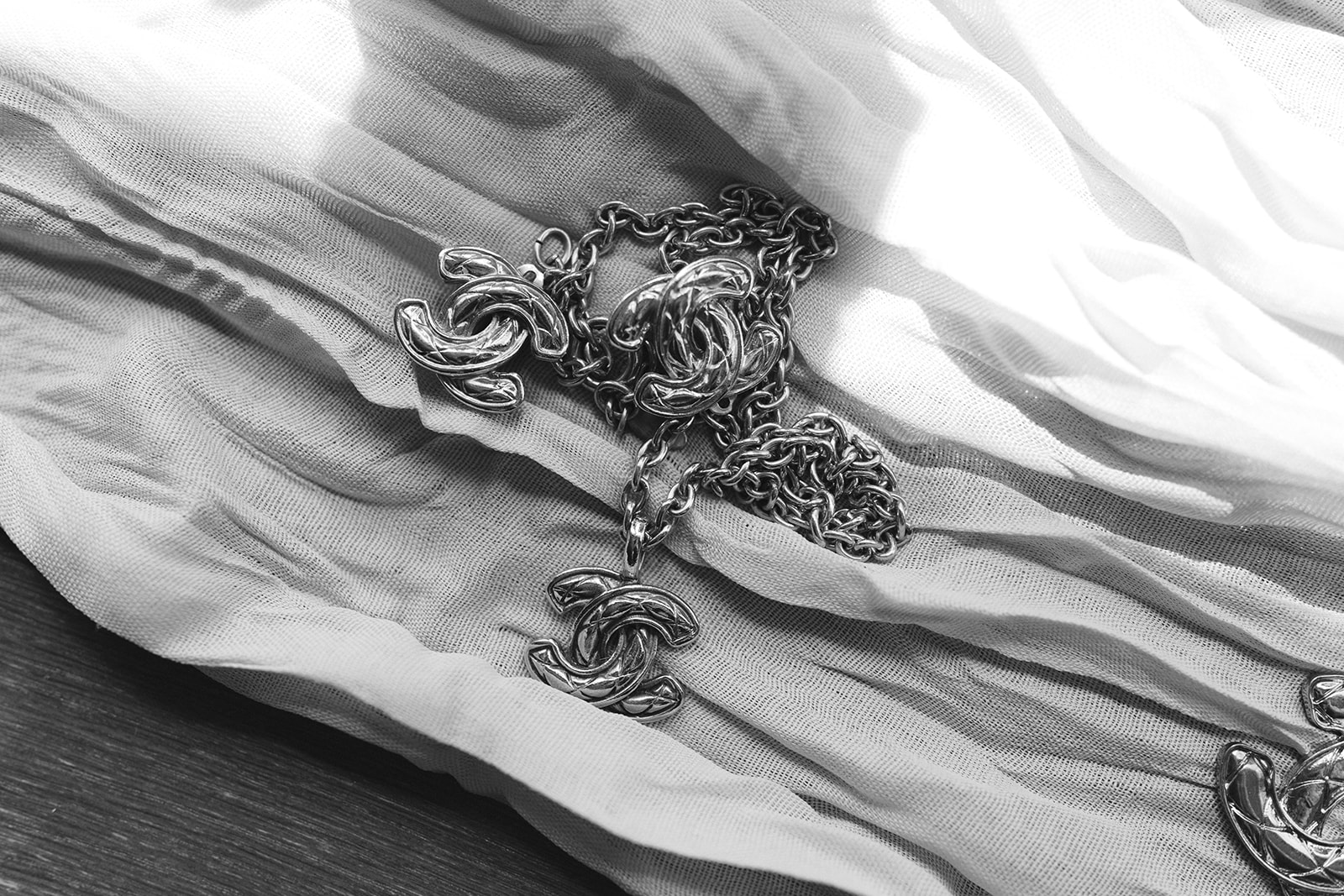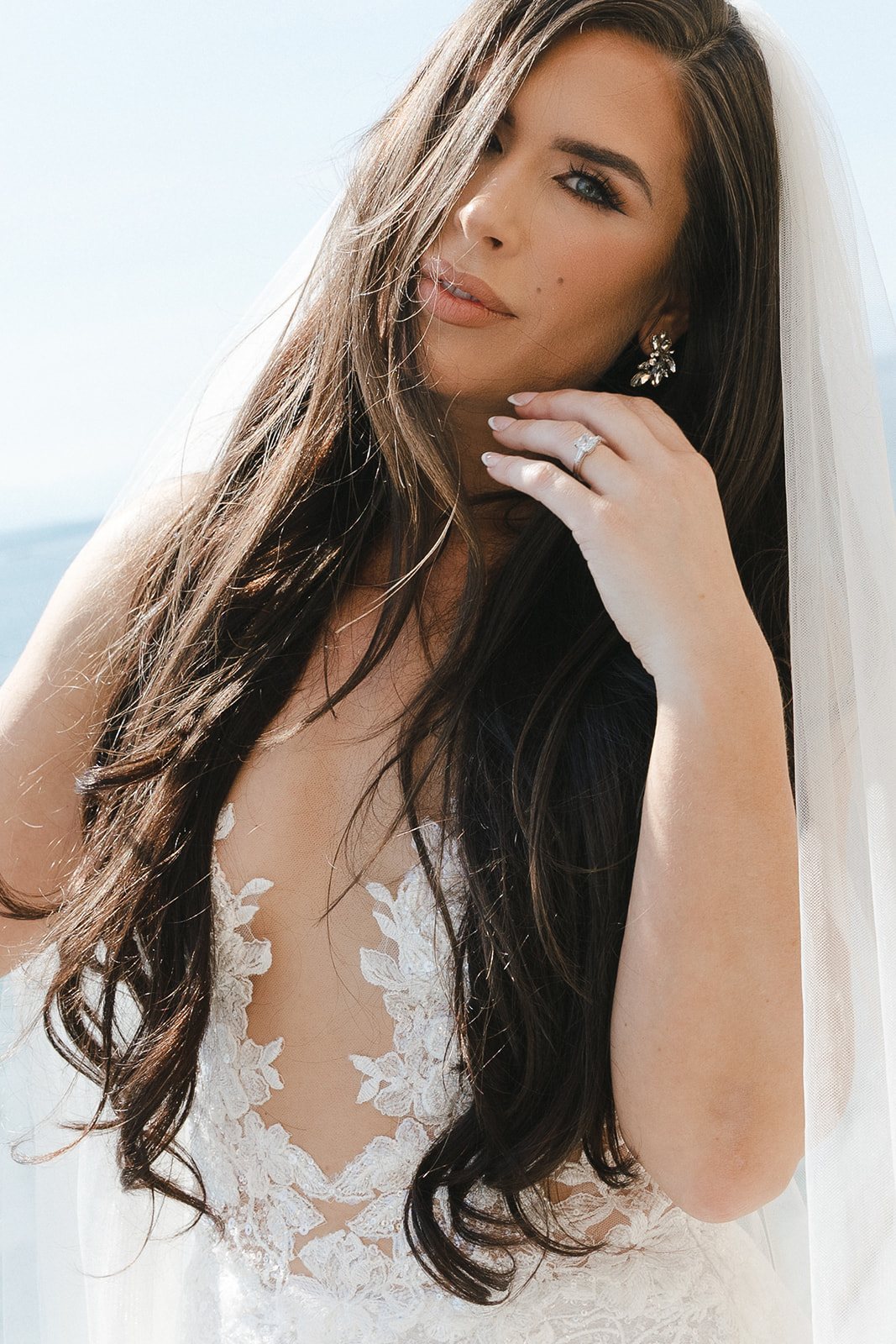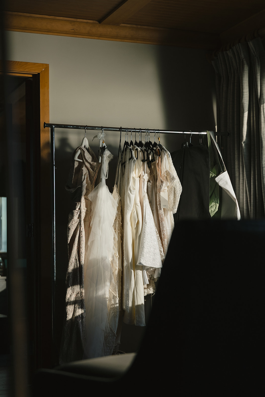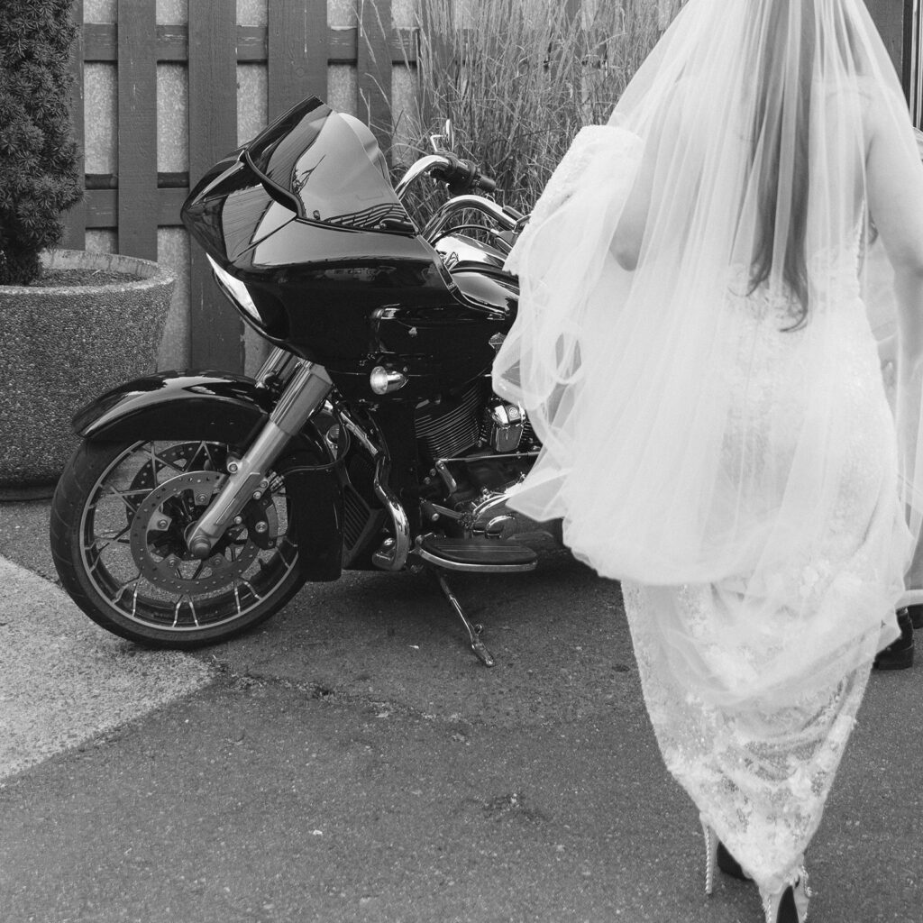 Emily got ready in a beautiful suite at the Edgewater, enjoying a morning of mimosas and stunning waterfront views alongside her closest group of gals. Donning silk black robes with champagne glasses in hand, these gorgeous women were Emily’s biggest cheerleaders as she prepared to walk down the aisle, and transformed into the most breathtaking bride. Designer jewelry and accessories covered seemingly every surface of the suite, with sparkling Swarovski necklaces, Versace perfume, Chanel chains, and glistening white pearls galore—too many to count. Emily was truly every bit the grunge-luxe bride she had been dreaming of, as was Mark as the groom, sporting a classy gray tux with a forest-green waistcoat.
