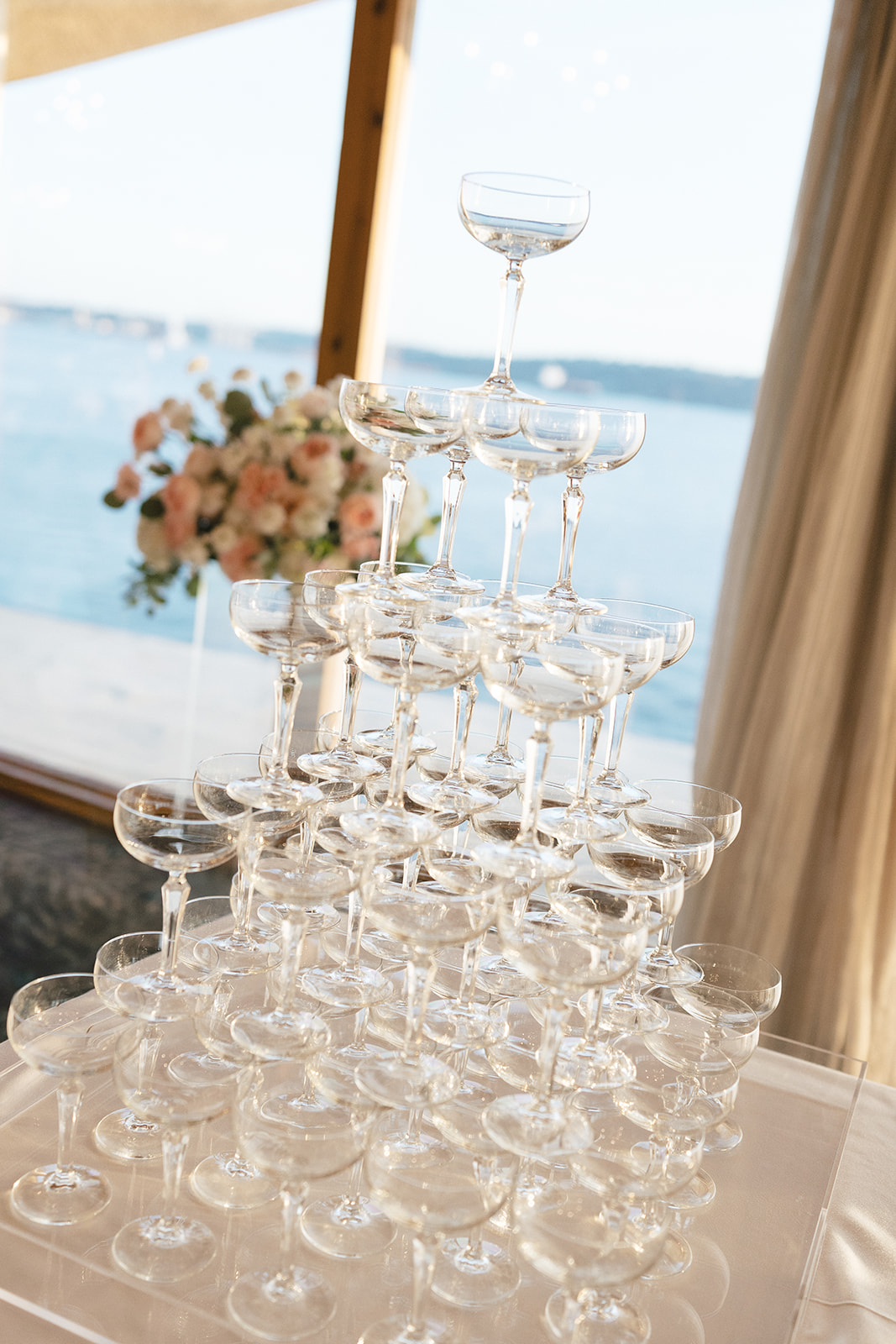 The Edgewater’s Olympic Ballroom is truly unlike any other waterfront ceremony venue in downtown Seattle, boasting an expansive wall of floor-to-ceiling windows with sweeping views of Elliott Bay, Puget Sound, and the Olympic Mountains. It was the perfect place for Emily and Mark to tie the knot in front of their loved ones, beneath crystal chandeliers and framed by symmetrical floral installations atop acrylic pillars. Ugh—obsessed.