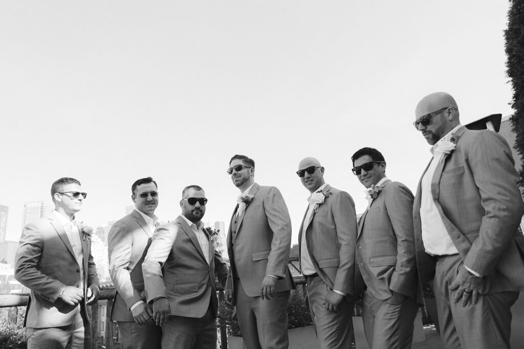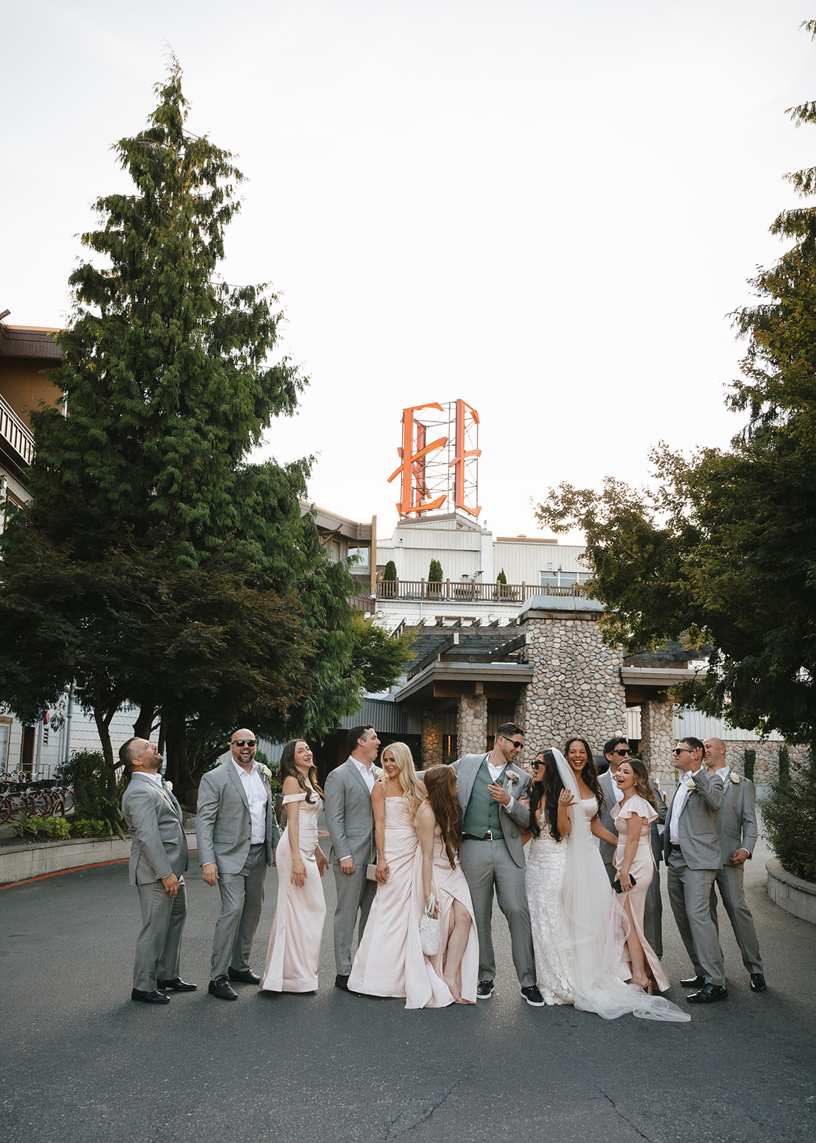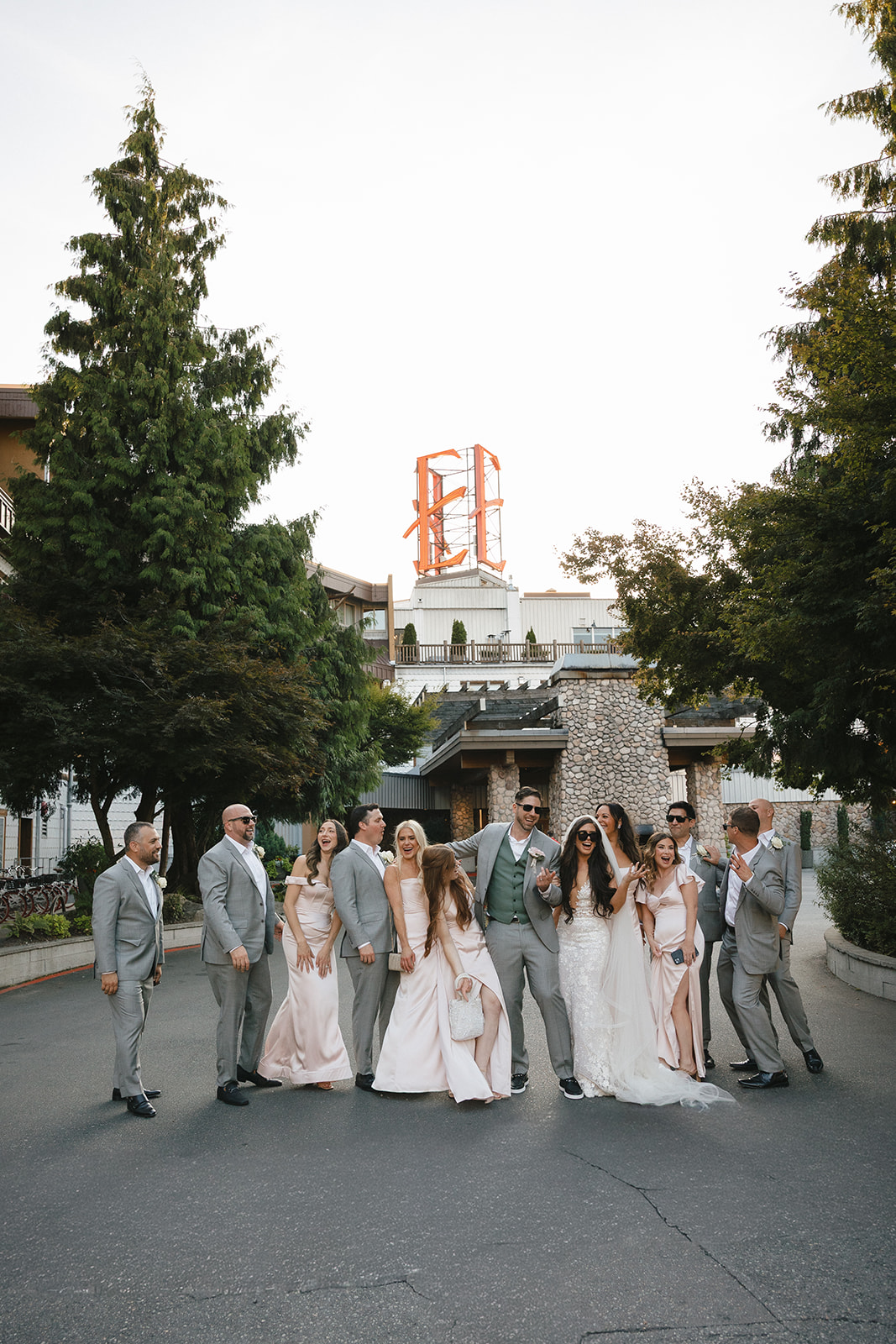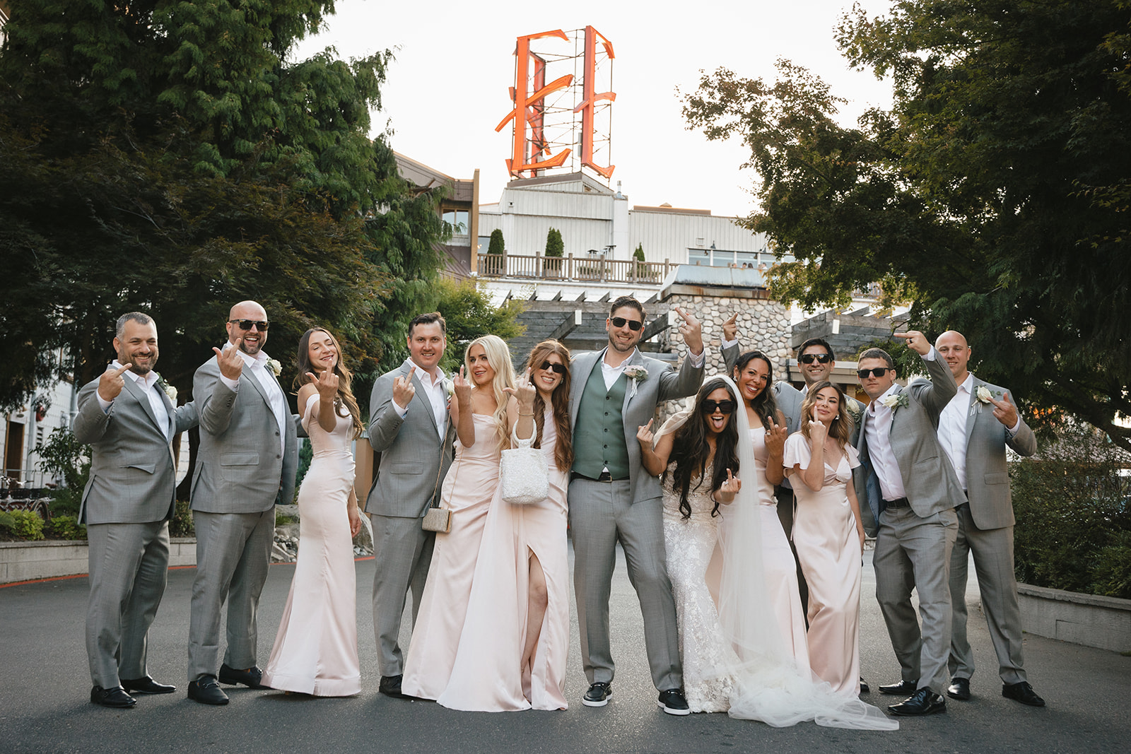 After a couple more glasses of champagne and hugs all around, we ventured outside for portraits by the waterfront—and eventually, back around to the front of the Edgewater for portraits with the hotel’s iconic neon “E”. If this is not the most snazzy wedding party I’ve ever seen, I’m not sure what is: the pale pink gowns, the designer purses, the oversized sunglasses… a dream group for me to style.
