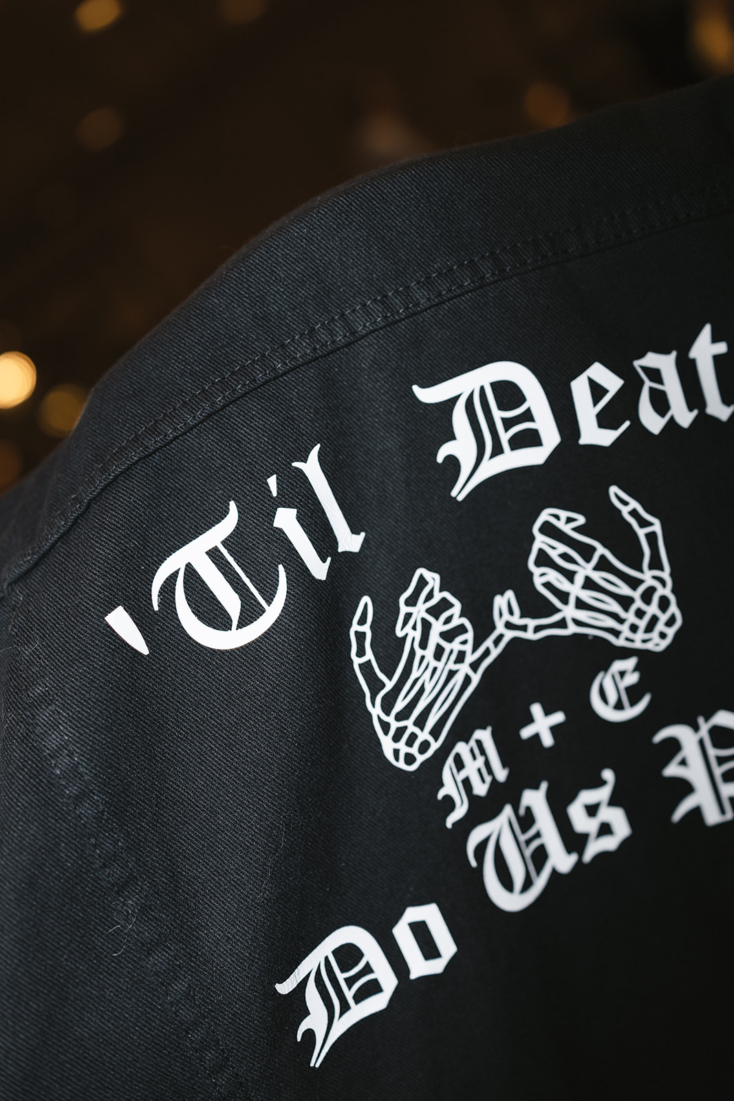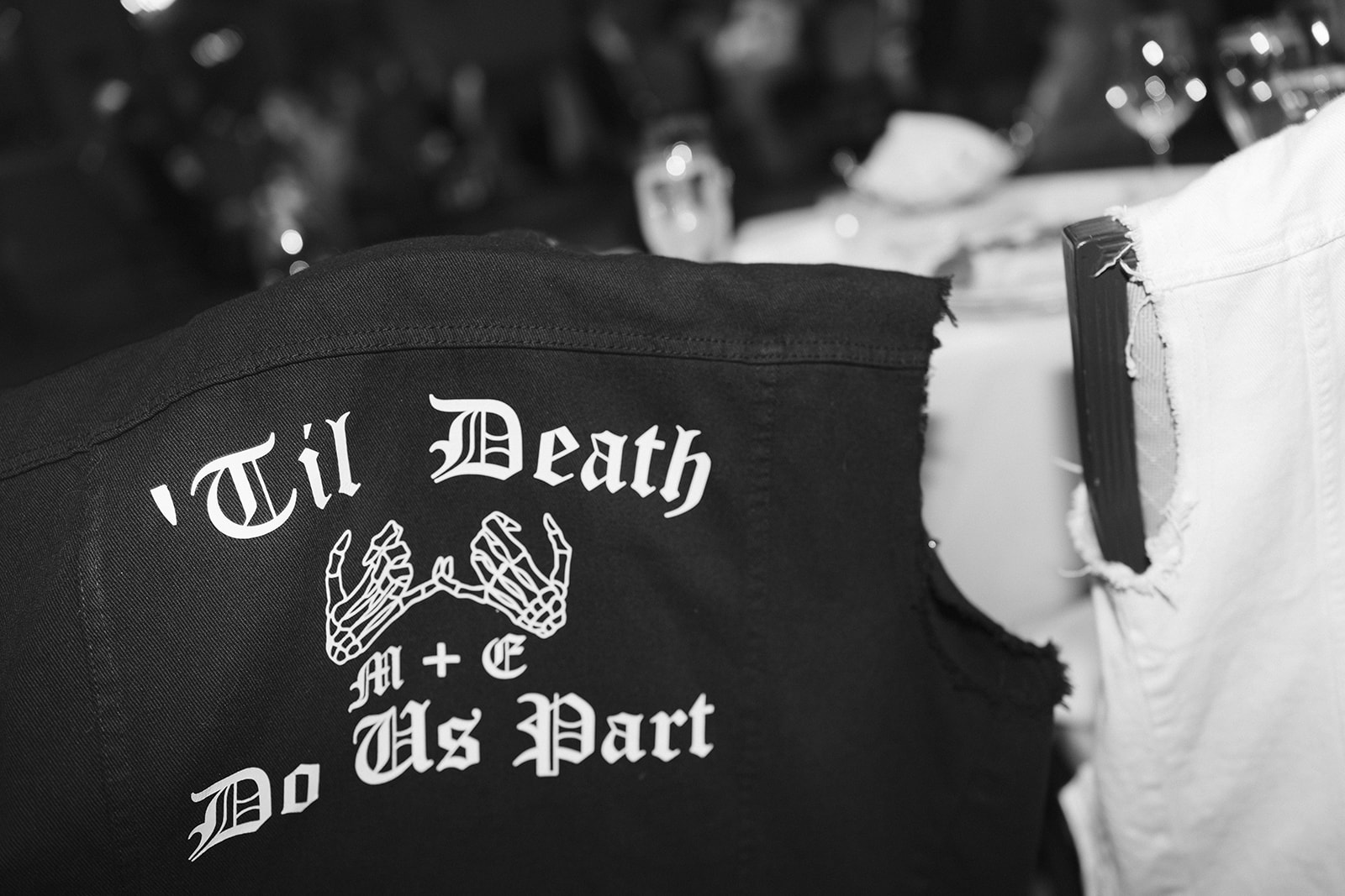 The newlyweds made their way into the ballroom for their grand entrance, ready to party with studded “Till Death Do Us Part” denim jackets and inflatable guitars to pass around the dance floor. No part of this reception was traditional or boring in the slightest—even their honeymoon fund game with a little extra fun for their guests, in the form of “Banned Songs” with price tags on them! I’m telling you, I work with the most creative and hilarious couples out there.