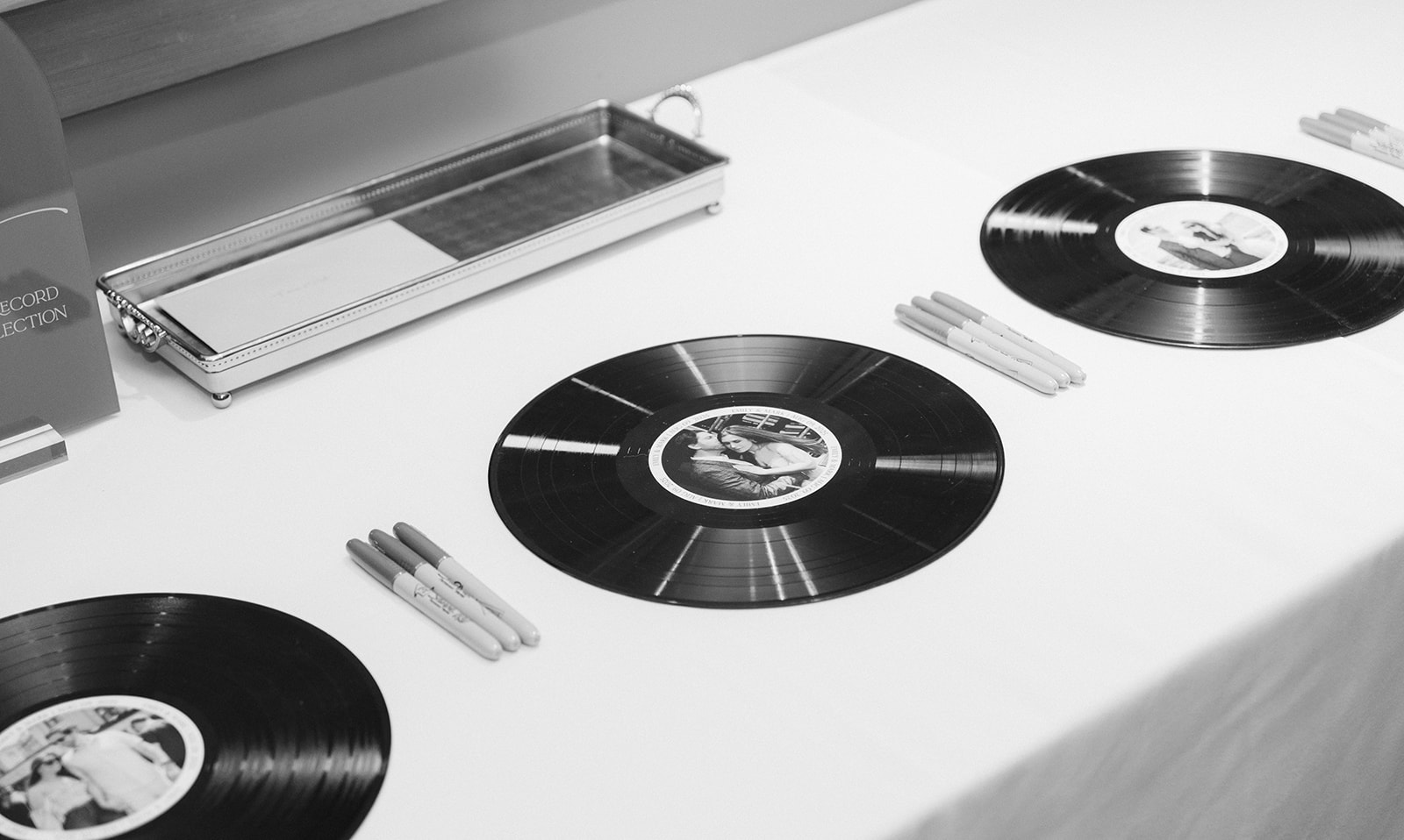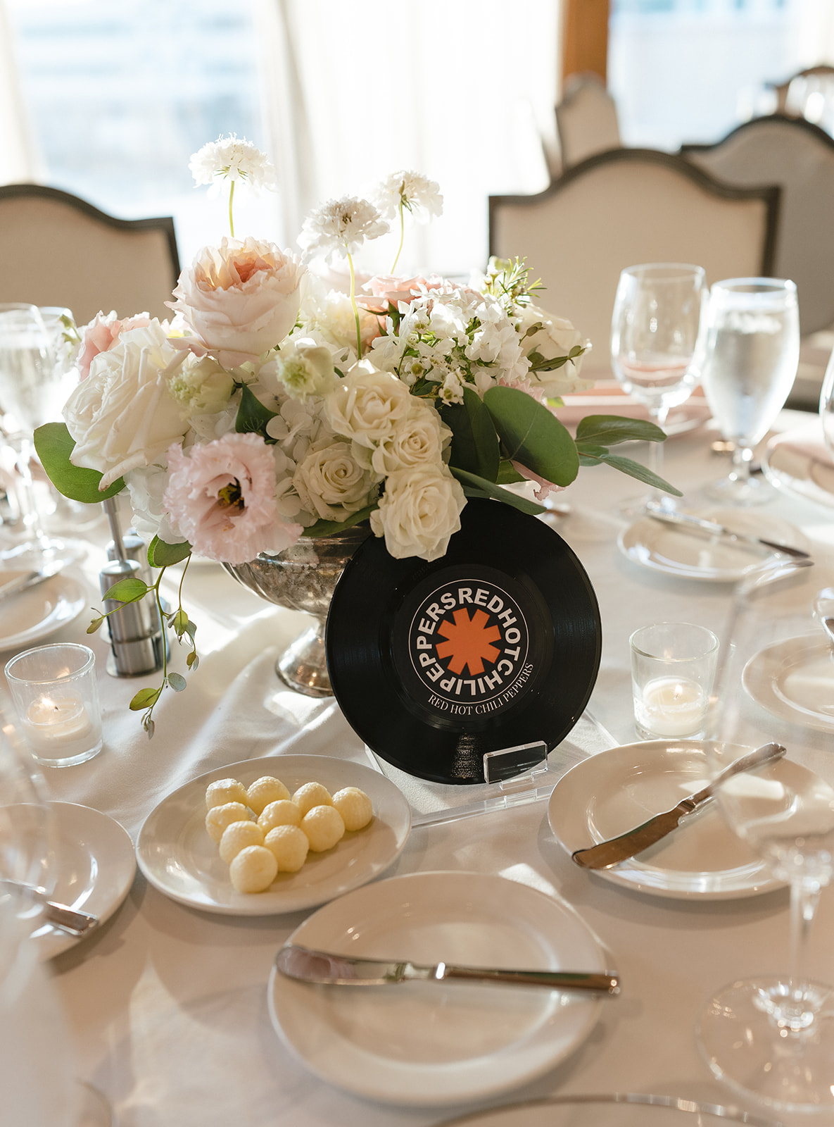This reception is really where Emily and Mark’s love for music came alive, starting with their seating chart in the form of concert tickets for their favorite bands. Every table had a band vinyl, including the Red Hot Chili Peppers, Metallica, and Slipknot, and their guestbook came in the form of—you guessed it—blank vinyls to sign.