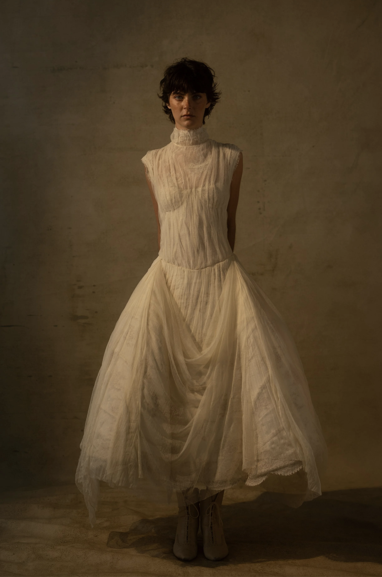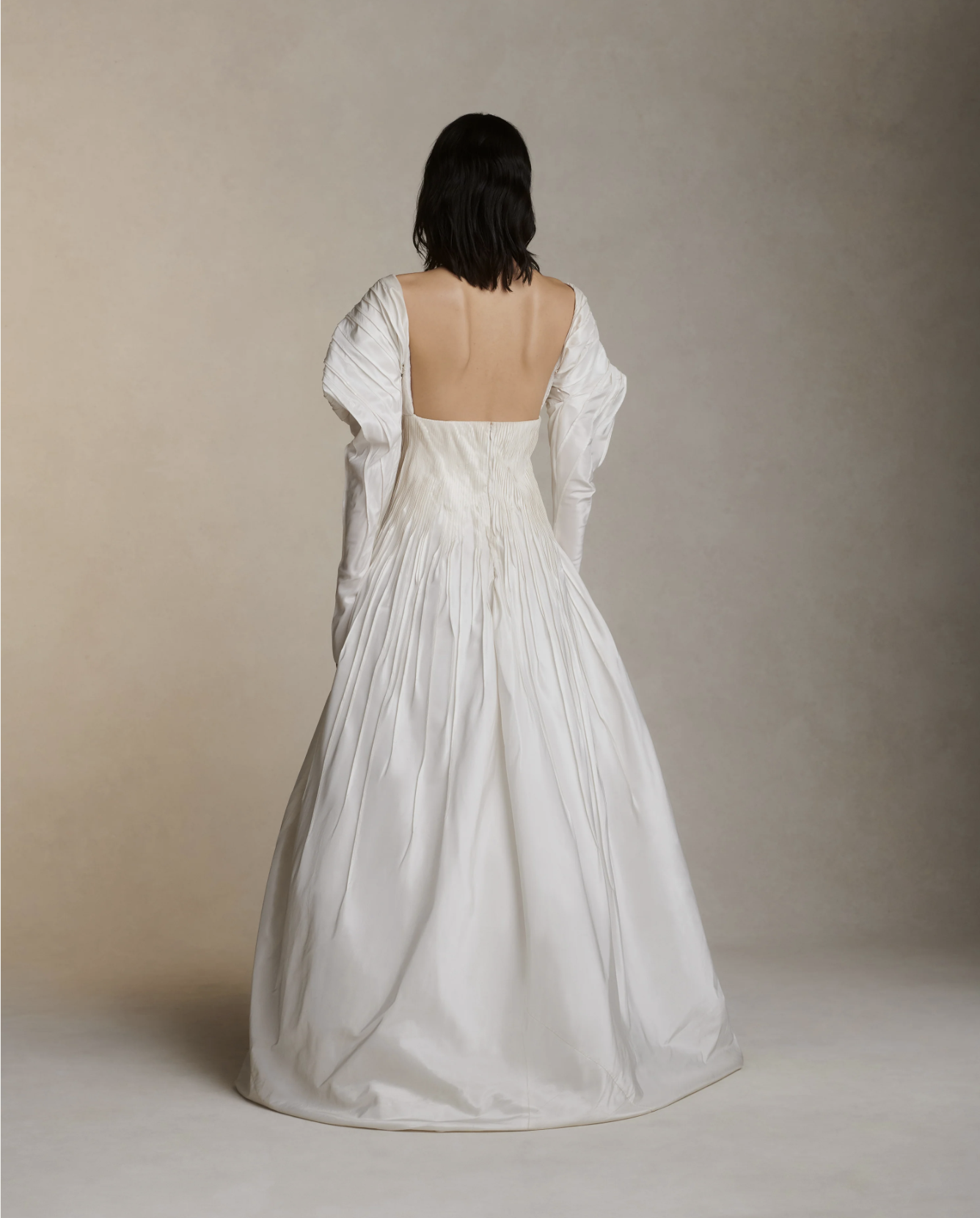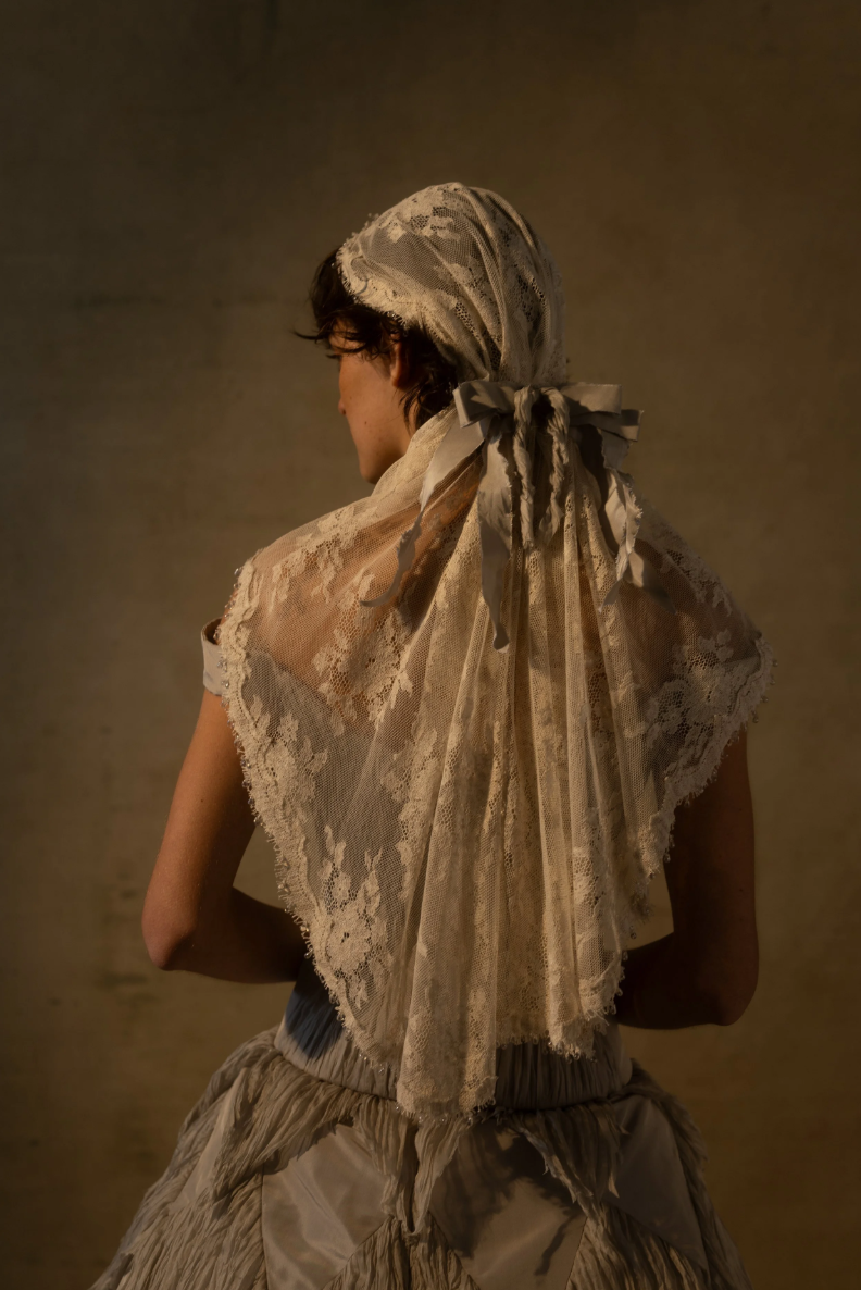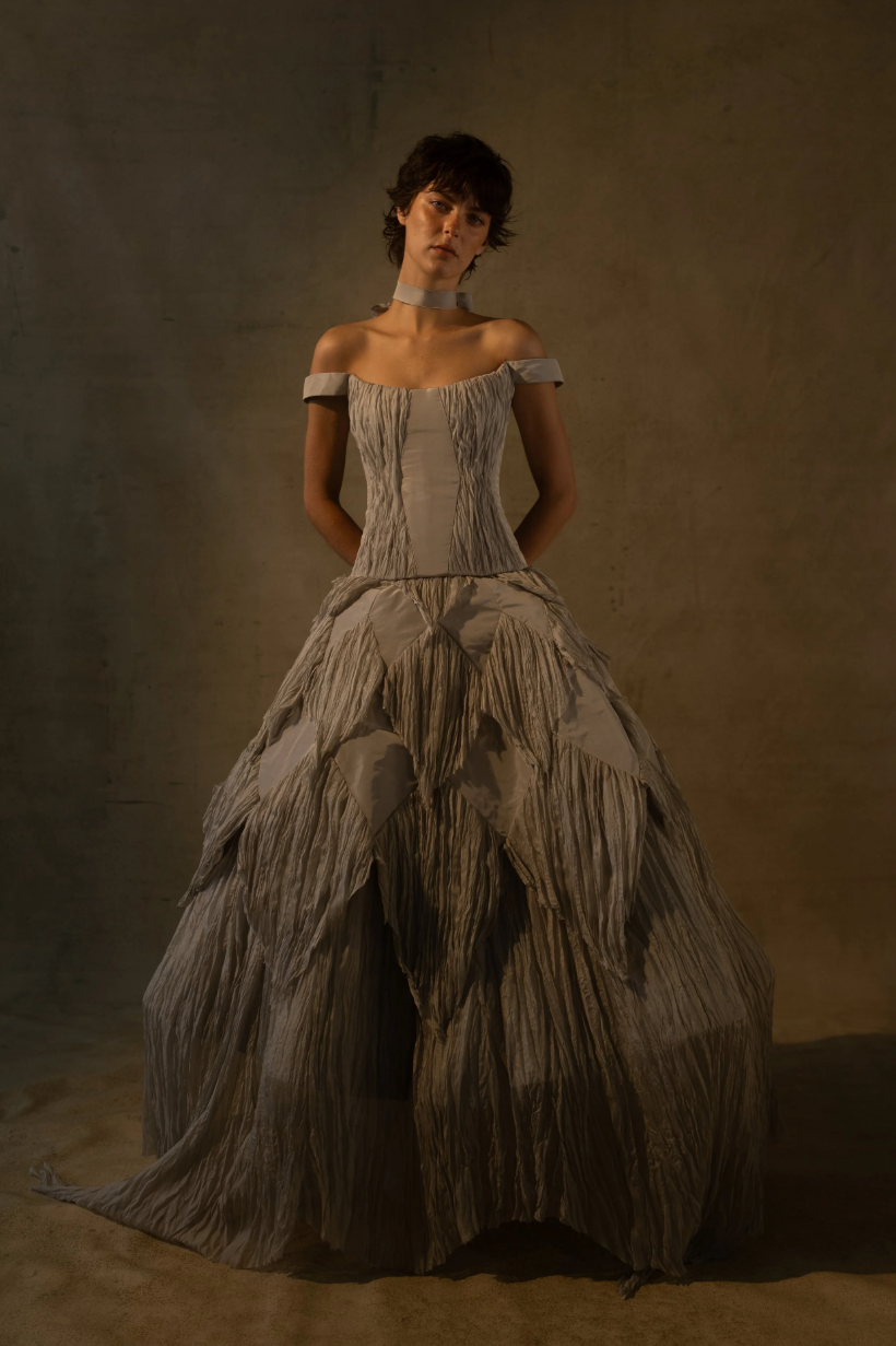 While you won’t find any dark blacks or edgy color palettes in CINQ’s current collections, it’s the details and materials that truly embody the timeless romance of Victorian-era designs—such as broomstick-plated chiffon, puffed sleeves, intricate bows, and glass beading. Collection V is by far the most gothic, drawing on a love for eras past with gowns that feel like they belong in an old painting at the Met.