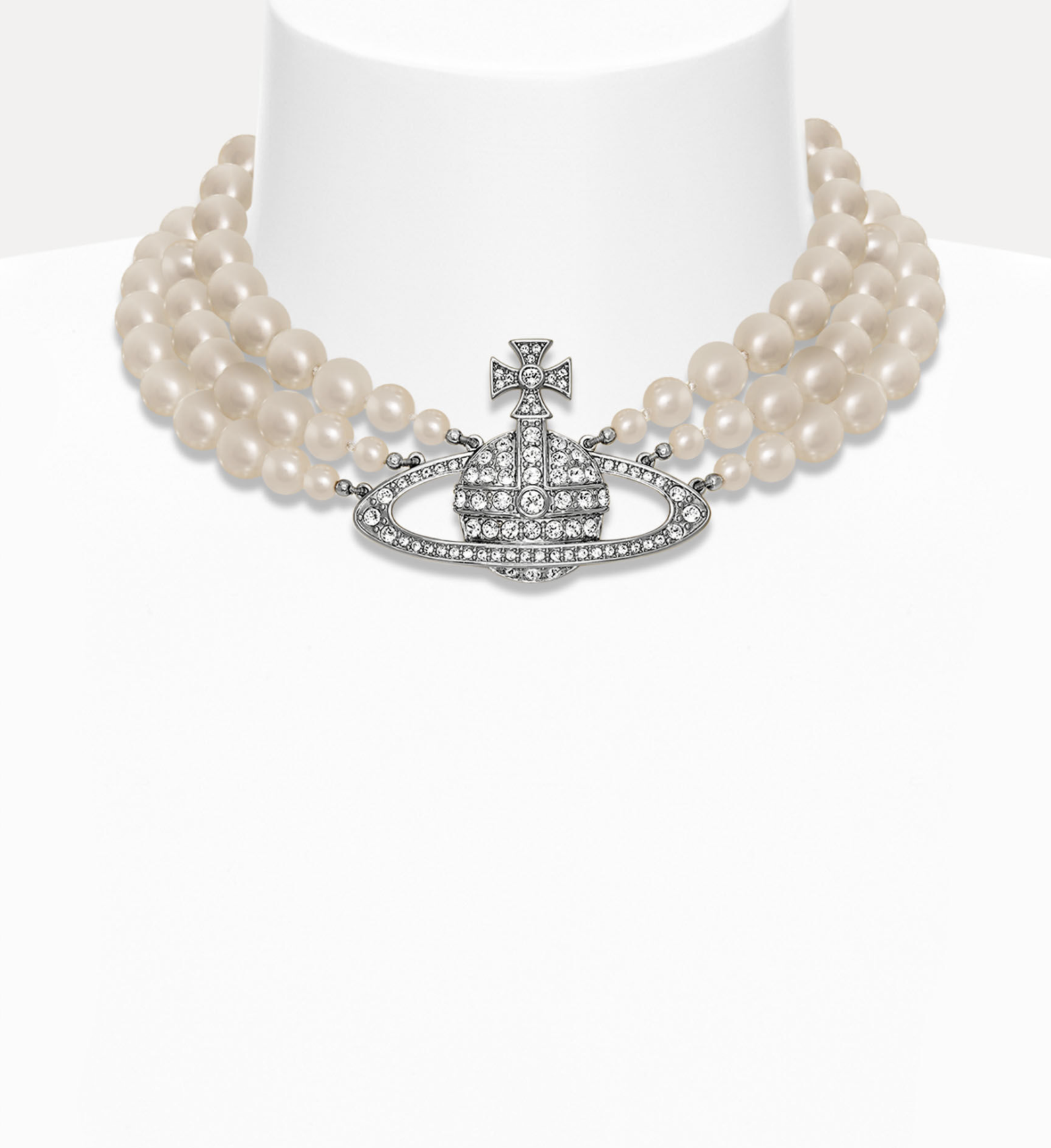 Now this Three Row Pearl choker is EVERYTHING. Inspired by classic pearl jewelry and Vivienne Westwood’s distinct punk-historical aesthetic, the main feature of this multi-row choker is a glittering bas relief orb front and center. The luxurious, white crystals, surrounded by a sea of shining pearls, make for the most stunning centerpiece to any gothic bridal look!