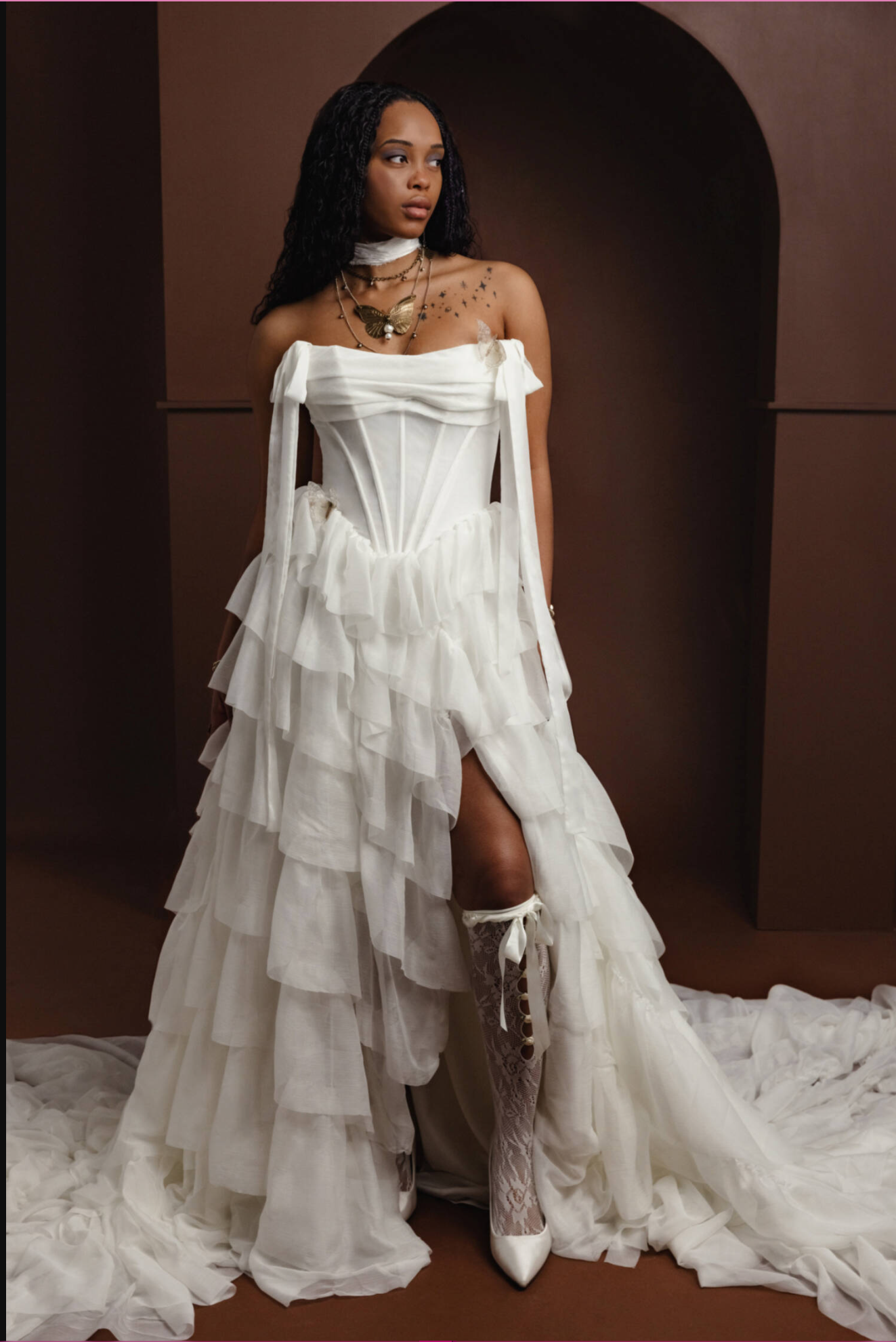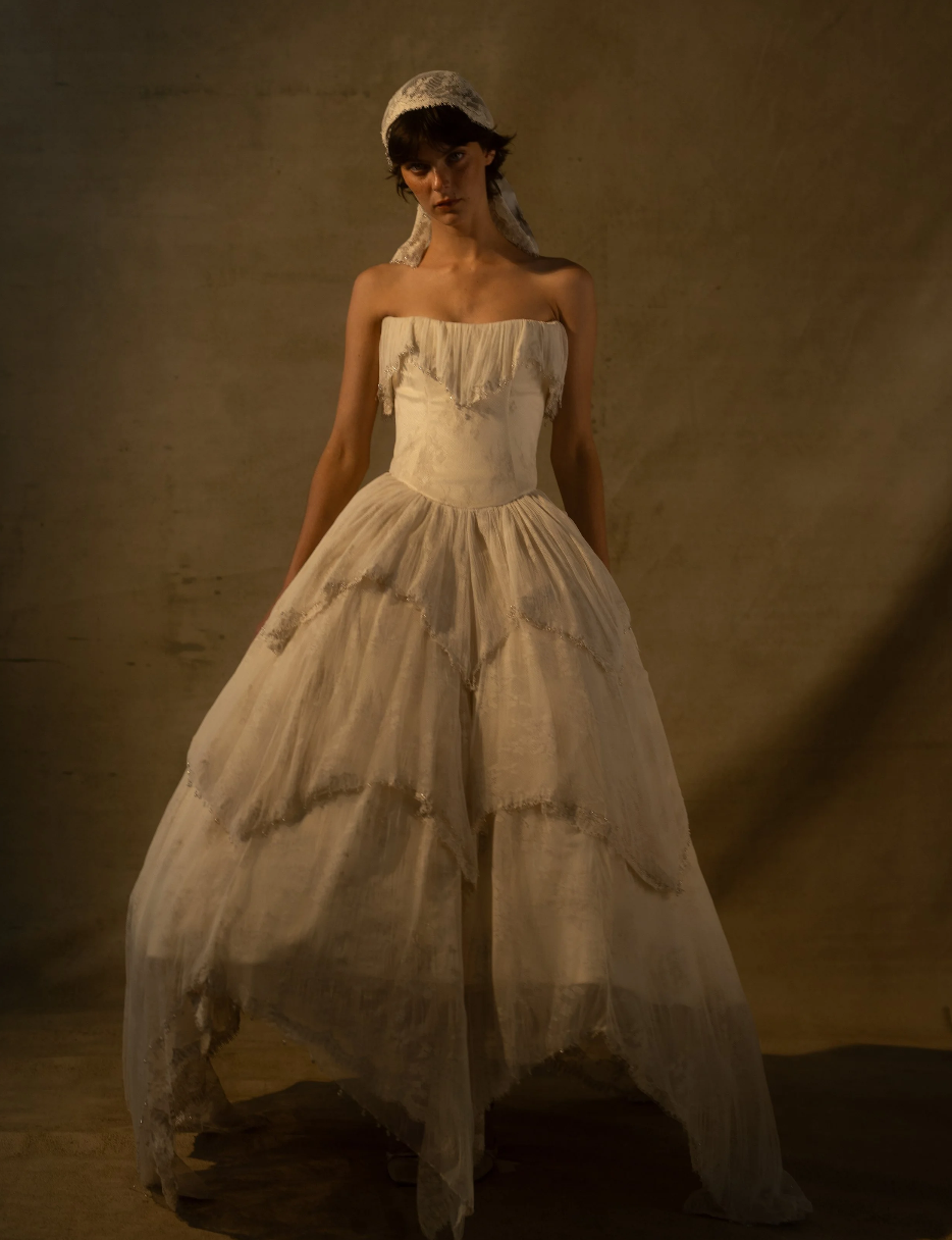 Rue de Seine has always been known for its unique, handmade designs that blend bohemian themes with contemporary elegance, never shying away from colors, shapes, illustrations, and patterns. Rue’s latest collection, Tales From The Seine, features gowns inspired by the artists, poets, and rebels of Paris, combining vintage touches with modern boho elements. Delicate embroidery, ruffles, and draped chiffons come together to create a timeless feel, reminiscent of antique lace curtains and romantic French gardens. The 19th-century-inspired corsetry, delicate lace detailing, and tiered skirts have me drooling… they’re giving Bridgerton in the best way. I am OBSESSED with all of the dresses in this collection, but here are a few favorites for that modern gothic feel!