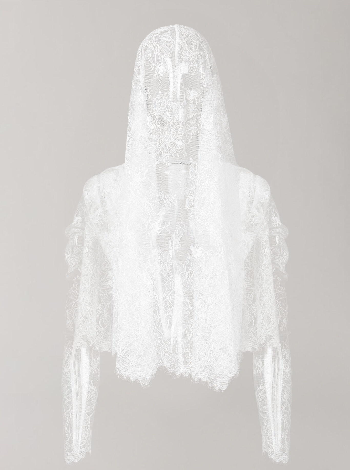 The Lace Fishu Blouse would be a dream to throw on over your wedding gown for a subtle gothic touch. The combination of the sleeved, hooded silhouette, floral-embroidered tulle, and delicate lace scallop details are oh-so-romantic, and can be put on display either as a veil or a shoulder wrap, tucked into the neckline.